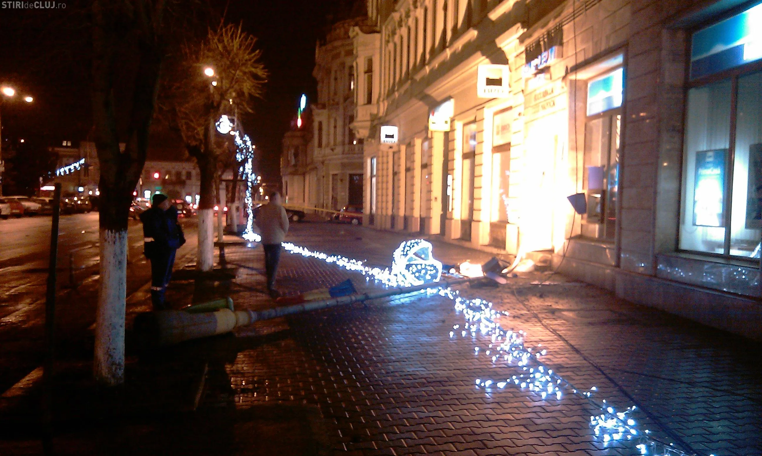 "Pagubele nu sunt insemnate, s-a spart un geam de la o banca si paravanul de protectie de la un bancomat. Stalpi s-au prabusit pentru ca erau foarte incarcati, atat cu firele de electricitate, cat si cu iluminatul de sarbatori. Electrica trebuie sa inlocuiasca cei doi stalpi, care probabil erau cam vechi", a declarat Oana Buzatu, purtatorul de cuvant al primariei Cluj Napoca.