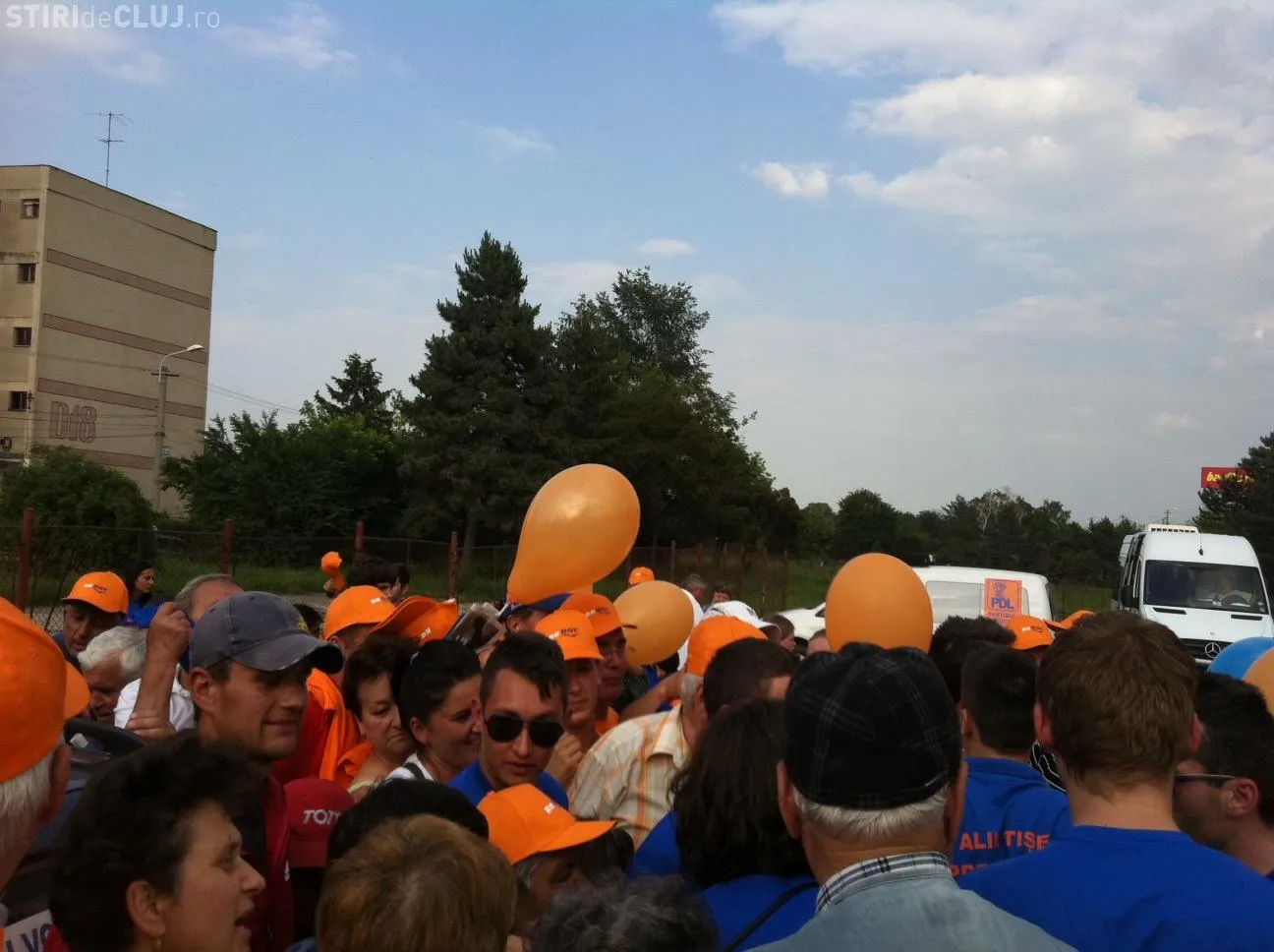 Mai multi sustinatori ai Partidului Democrat Liberal (PDL) Cluj s-au inghesuit vineri, 8 iunie, la Expo Transilvania, la un concert de muzica, pentru a primi cate un tricou sau un balon.