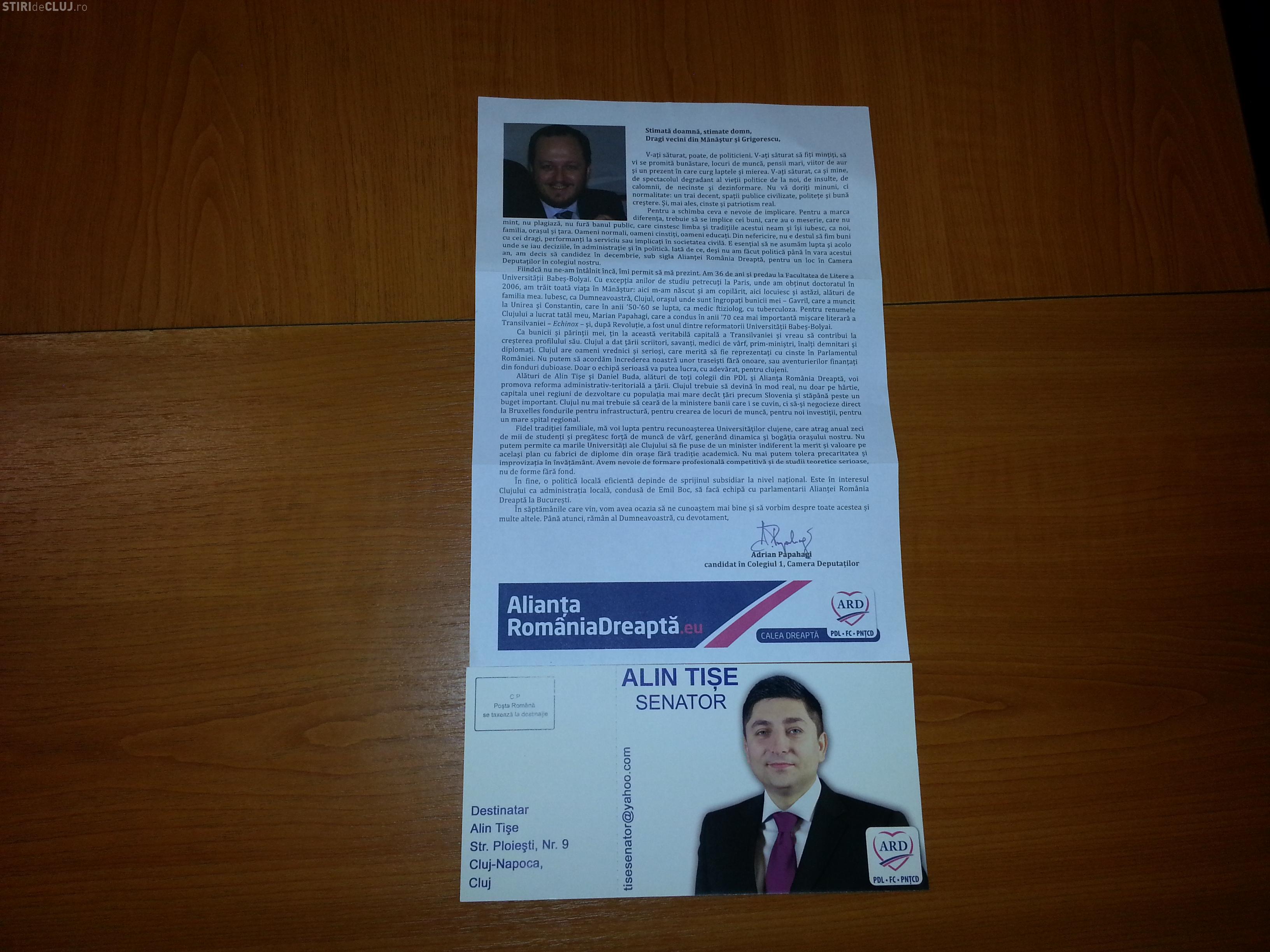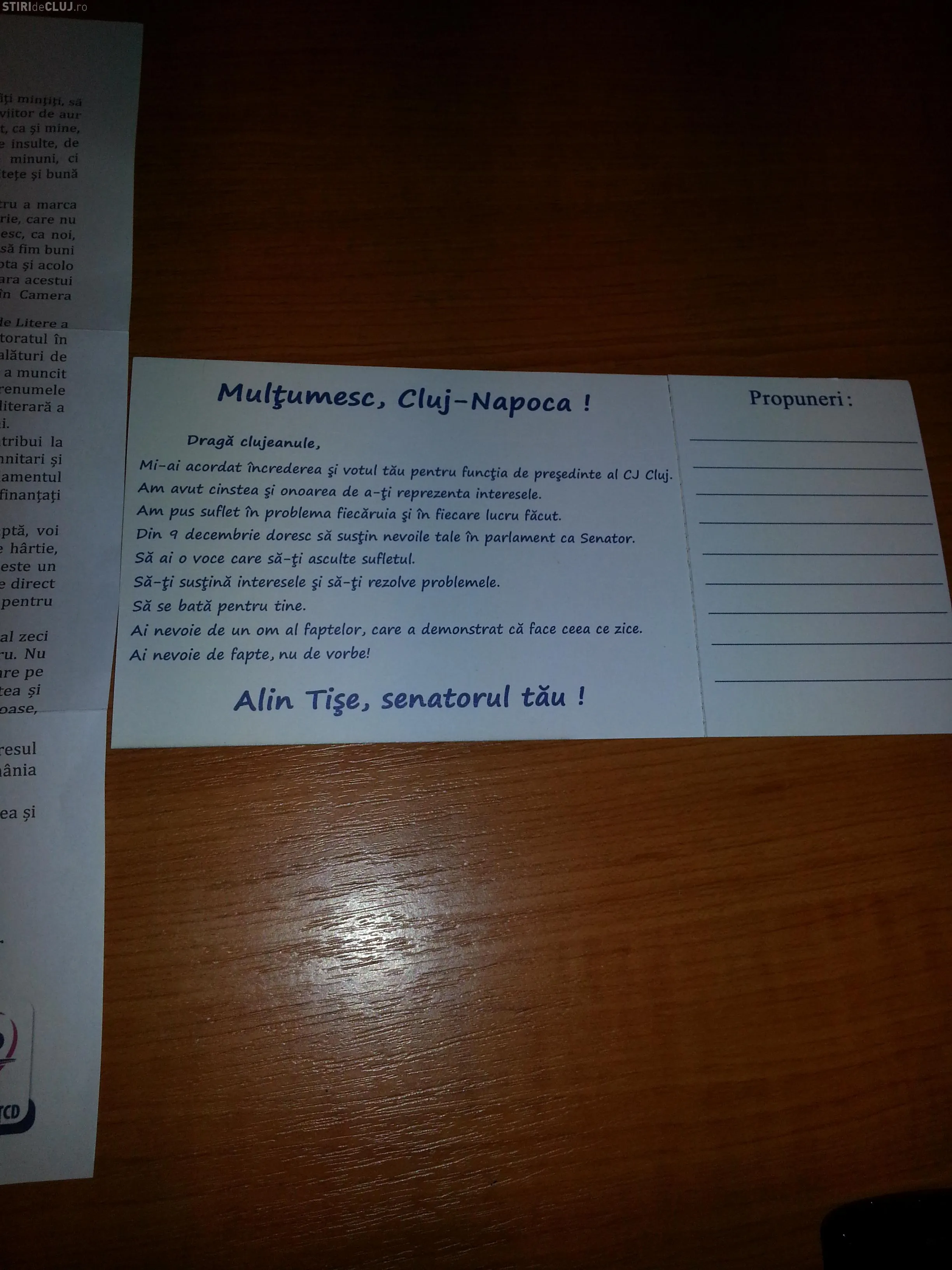 La rânul lui, Alin Tișe, se laudă cu faptul că a luat votul clujenilor pentru Consiliul Județean (CJ) Cluj, dar nu precizează că a și pierdut lupta. ”Din 9 decembrie doresc să susțin nevoile tale în parlament ca senator. Să ai o voce care să îți asculte sufletul. Să se bată pentru tine. Ai nevoie de un om al faptelor, care a demonstrat că face ceea ce zice”, a scris Tișe în scrisoare.