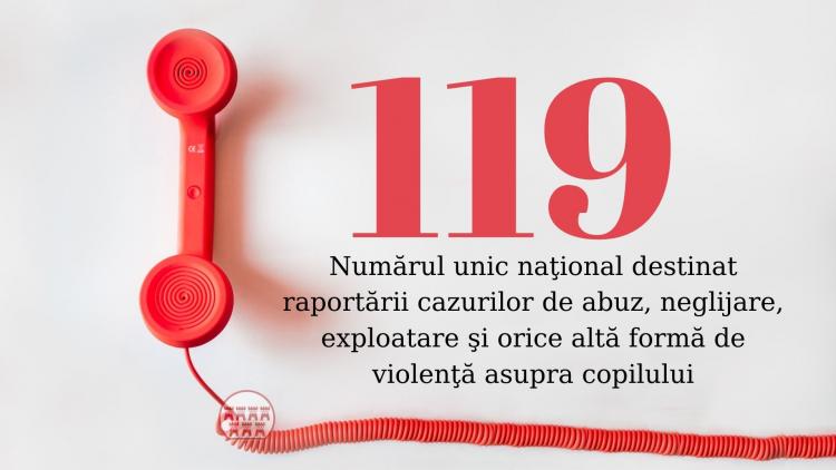Prin apelarea numărului 119, disponibil în toate rețelele publice de comunicații din România, pot fi raportate, în regim non-stop, toate cazurile de abuz, exploatare, neglijare și forme de violență asupra copiilor, inclusiv bullying, respectiv toate situațiile care nu necesită intervenția imediată a autorităților specializate din cadrul Serviciului de Urgență 112.