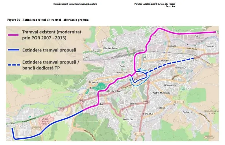 Planul de Mobilitate Urbană Durabilă realizat pentru Primăria Cluj-Napoca de o firmă britanică propune ca tramvaiul să meargă săre Florești prin spatele Polus.