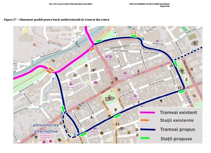 • Realizarea unei bucle unidirecționale de în zona centrală a orașului, care să fie parcursă de tramvaiele venind dinspre Florești și Mănăștur pe de o parte, și Gară și Muncii pe de altă parte, cu stații dense în zona ultracentrală, un posibil aliniament fiind prezentat în figura de mai jos, însă urmând a fi rafinat în etapa finală a PMUD.