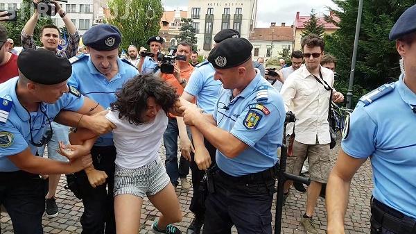 Actrița Oana Mardarea fost bruscată, sâmbătă, de jandarmi în timp ce se afla în Piaţa Avram Iancu şi a întrerupt discursul organizatorilor mitingului organizat de Noua Dreaptă, PRM şi PRU despre familia tradiţională.