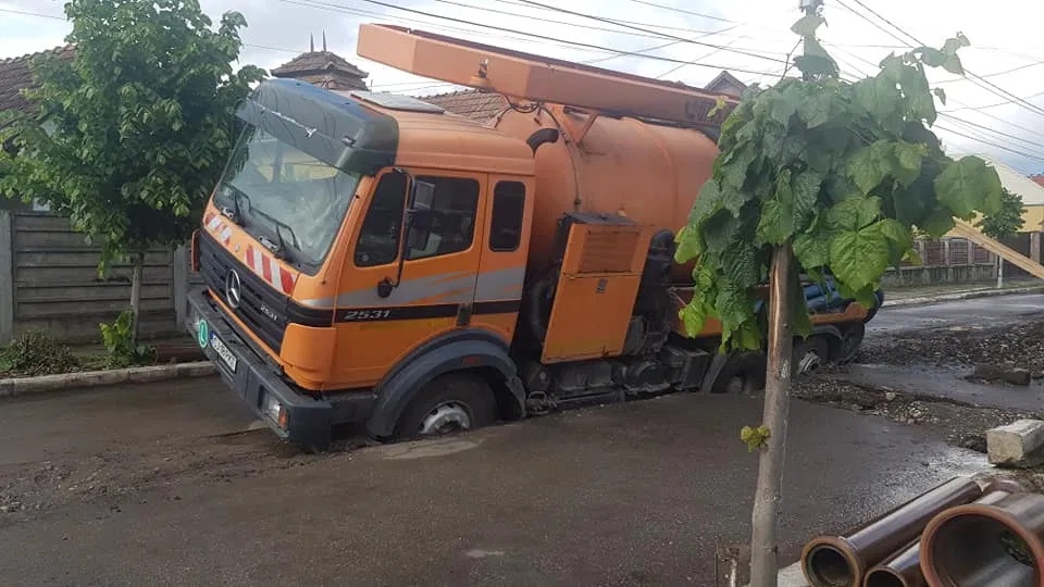 Șoferul unei vidanje a intrat pe un drum în lucru din Câmpia Turzii și s-a trezit că s-a ”scufundat” într-un șanț ce urma să fie asfaltat.