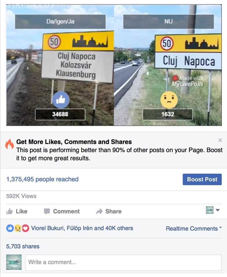 Un sondaj realizat pe Facebook de organizația Musai-Muszáj a arătat că clujenii își doresc plăcuțe trilingve la intrarea în municipiu.