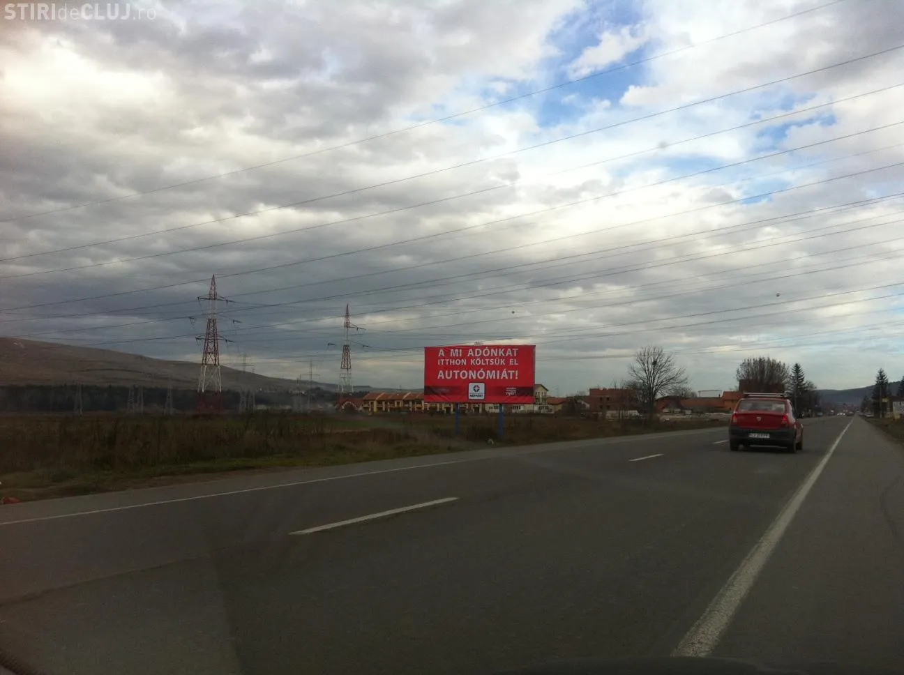 Pe panoul montat de PPMT scrie: ”Impozitele noastre să le cheltuim la noi acasă. Autonomie!”.
