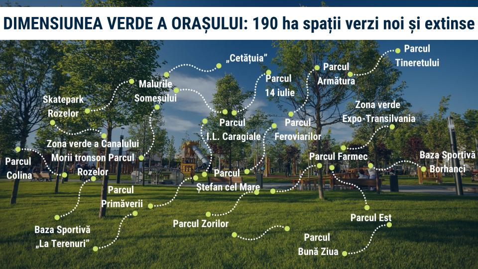 ”Sunt 190 de hectare de spații verzi noi și extinse în municipiu, din care 160 sunt noi. Să vă spun care sunt noi? Parcul Tineretului are 21 de hectare, în Pădurea Clujenilor, de pe Bulevardul Muncii. Parcul Est are 45 de hectare, pe care îl amenajăm de la zero. Parcul Bună Ziua, Parcul Zorilor, unde deja este licitație și vom intra la execuție în acest an. Parcul Borhanci pe 77 de hectare. Baza Sportivă ”La terenuri” - Mănăștur, pe 4,4 hectare, cu termen de finalizare în acest an. Am anunțat că va fi terminat”, a spus primarul Emil Boc.