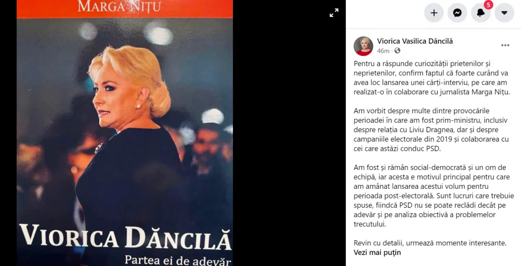 Într-un mesaj publicat luni pe Facebook, Viorica Dăncilă spune că a amânat lansarea cărții după alegerile parlamentare ca să nu afecteze rezultatul partidului, dar „sunt lucruri care trebuie spuse”.