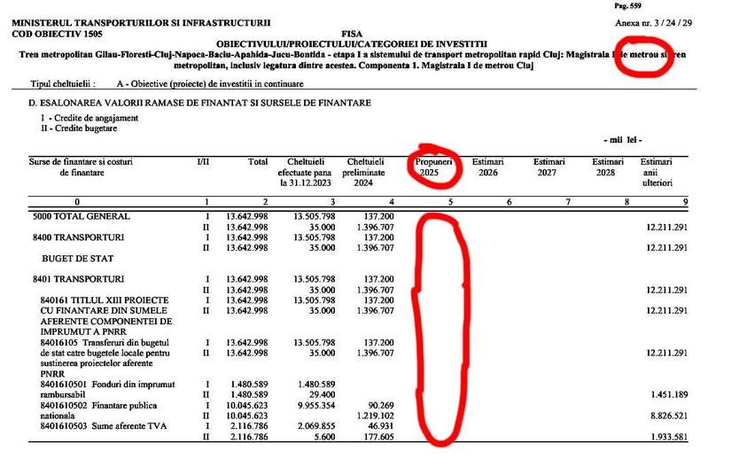 „Zero lei pentru metroul clujean din bugetul național în 2025. În imagine, fișa de proiect a "metroului", așa cum a fost avizată ieri în Parlament” a transmis activistul clujean.