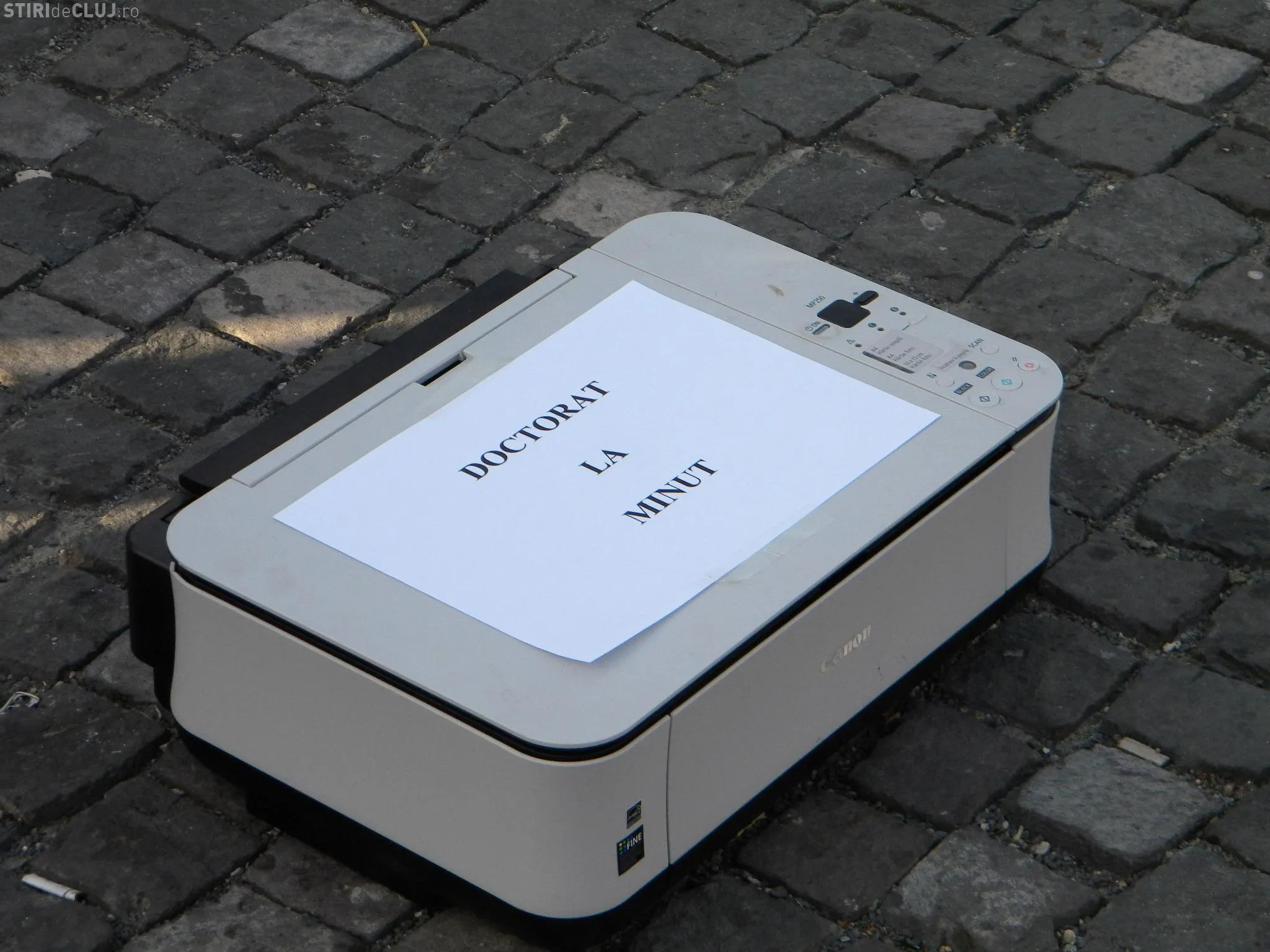 Protestatarii au avut la ei şi o imprimantă pentru a face "doctorat la minut". "Cine vrea un doctorat e gata într-un minut. Repede şi se poate în orice domeniu", a spus unul dintre protestatari.