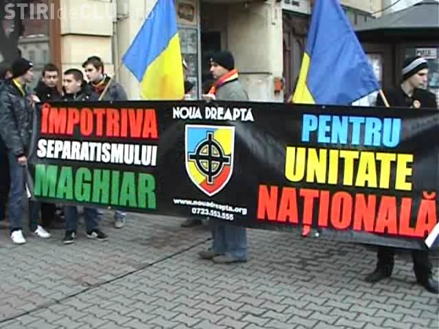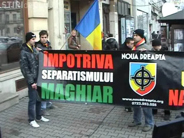 Un grup de 15 persoane, reprezentanţi ai organizaţiei Noua Dreaptă din Cluj-Napoca, au protestat astăzi, 11 februarie, în faţa Consulatului Ungariei, împotriva separatismului maghiar şi a iniţiaitivei de autonomie cerută de reprezentaţii politici ai maghiarilor din România.