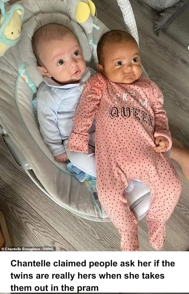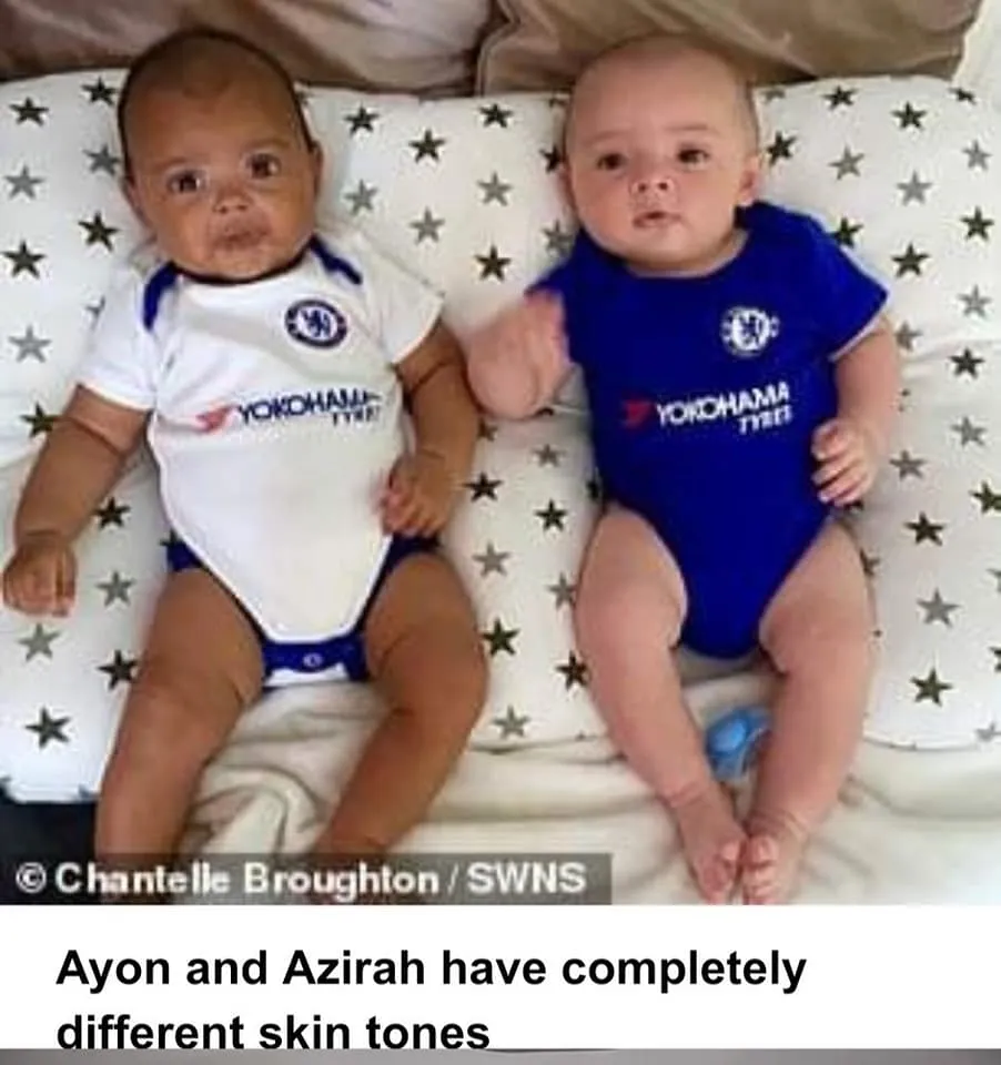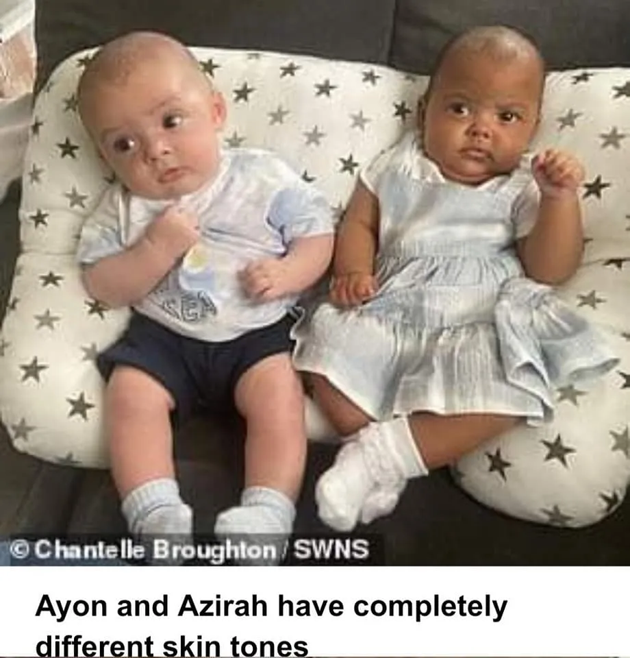 Chantelle Broughton (29 de ani) l-a născut prima dată pe fiul ei, Ayon la spitalul din Nottingham City. Acesta acea pielea deschisă și ochii verzi. Ulterior a născut-o şi pe fetiţa sa, Azirah, care avea tenul închis la culoare și ochii căprui, potrivit Daily Mail.