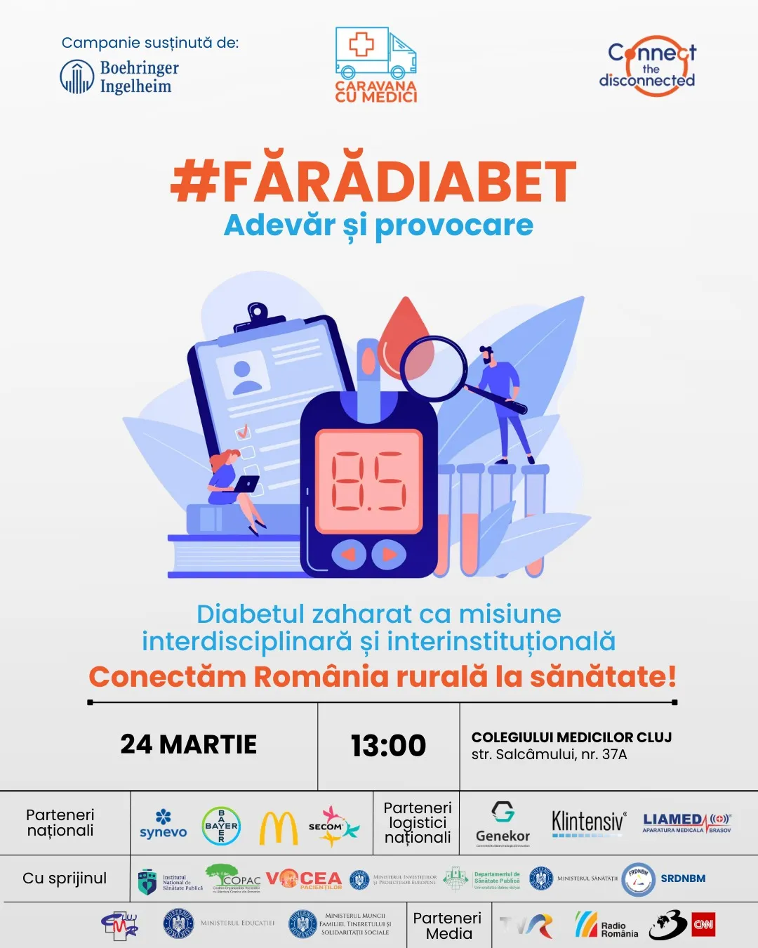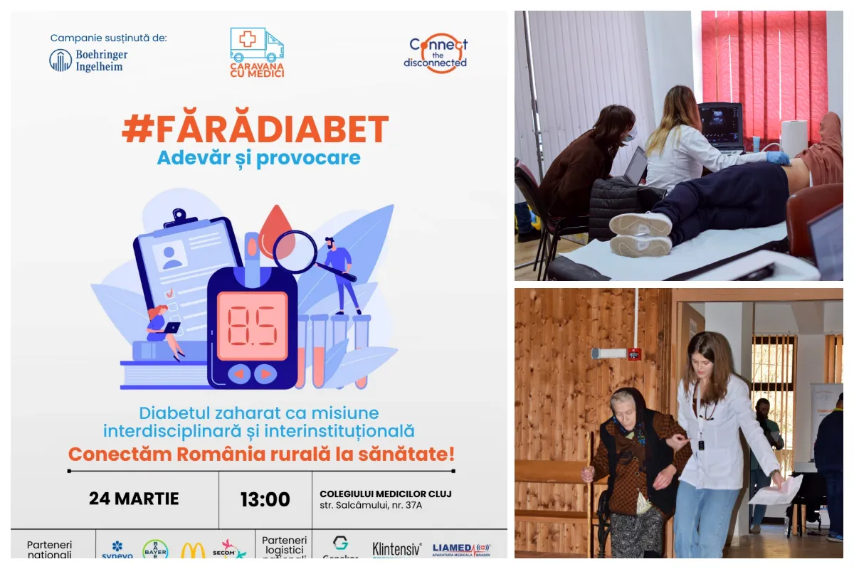 Pentru mii de pacienți, diferența dintre o viață activă și complicații ireversibile stă într-un diagnostic la timp și un parcurs medical lipsit de bariere birocratice. Plecând de la această realitate, Asociația Caravana cu Medici organizează marți, 24 martie 2026, conferința regională de tip masă rotundă cu titlul „ #FărăDiabet: Adevăr și Provocare – Diabetul zaharat ca misiune interdisciplinară și interinstituțională”. Evenimentul va avea loc la sediul Colegiului Medicilor Cluj (str. Salcâmului, nr. 37A), în intervalul orar 13:00 – 17:00.