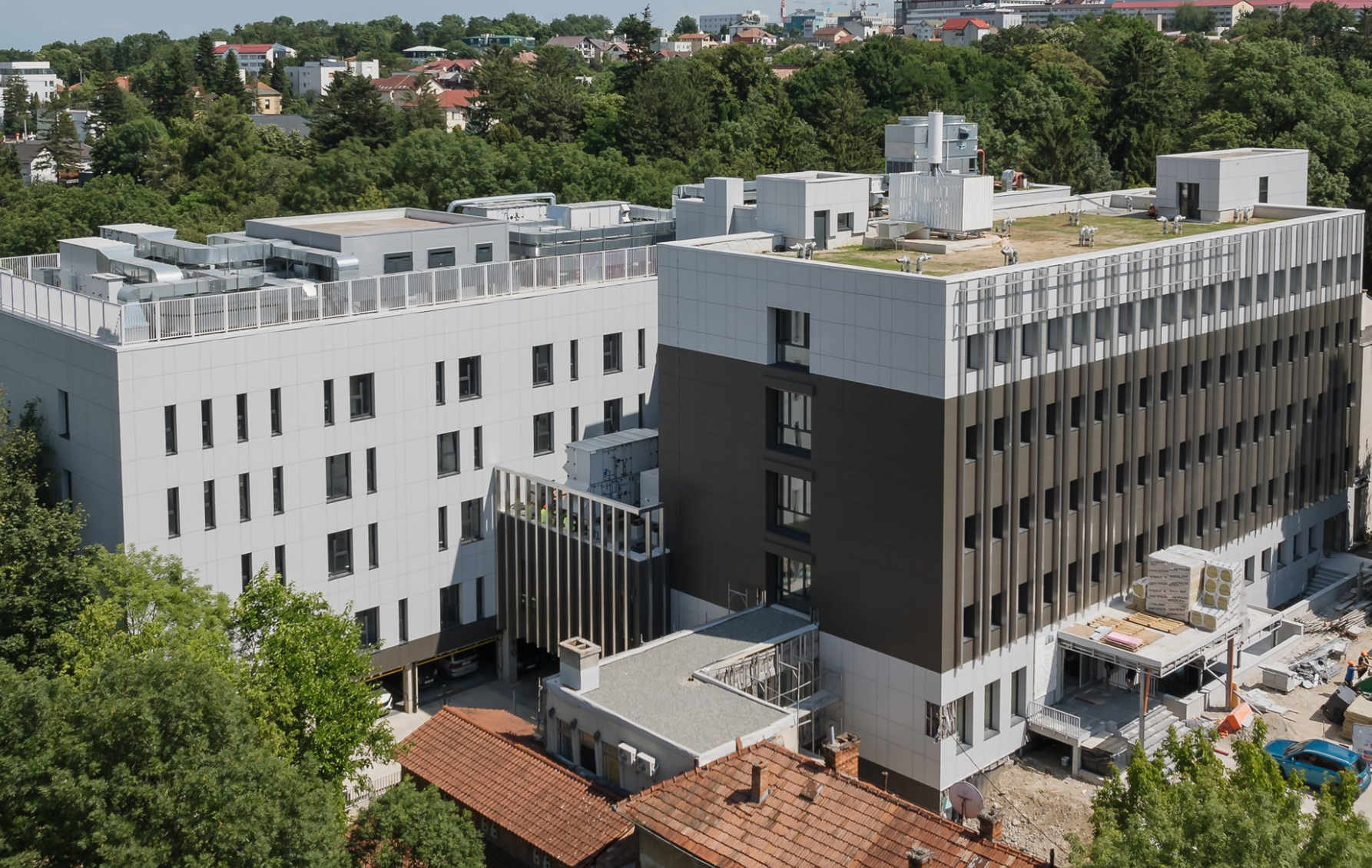 La corpul existent, finisajele și tâmplăria sunt aproape terminate, iar exteriorul este conturat prin amenajarea spațiilor verzi, placarea treptelor cu piatră și închiderea fațadei ventilate din HPL.