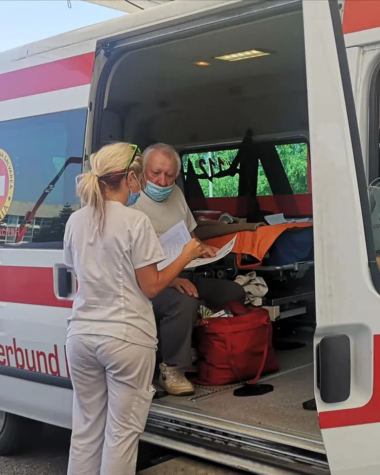 Vine o ambulanță și întra în standul de vaccinare. Coboară șoferul și deschide ușa din spate unde ședea pe scaun înconjurat de câteva plase un domn trecut de 70 de ani.
