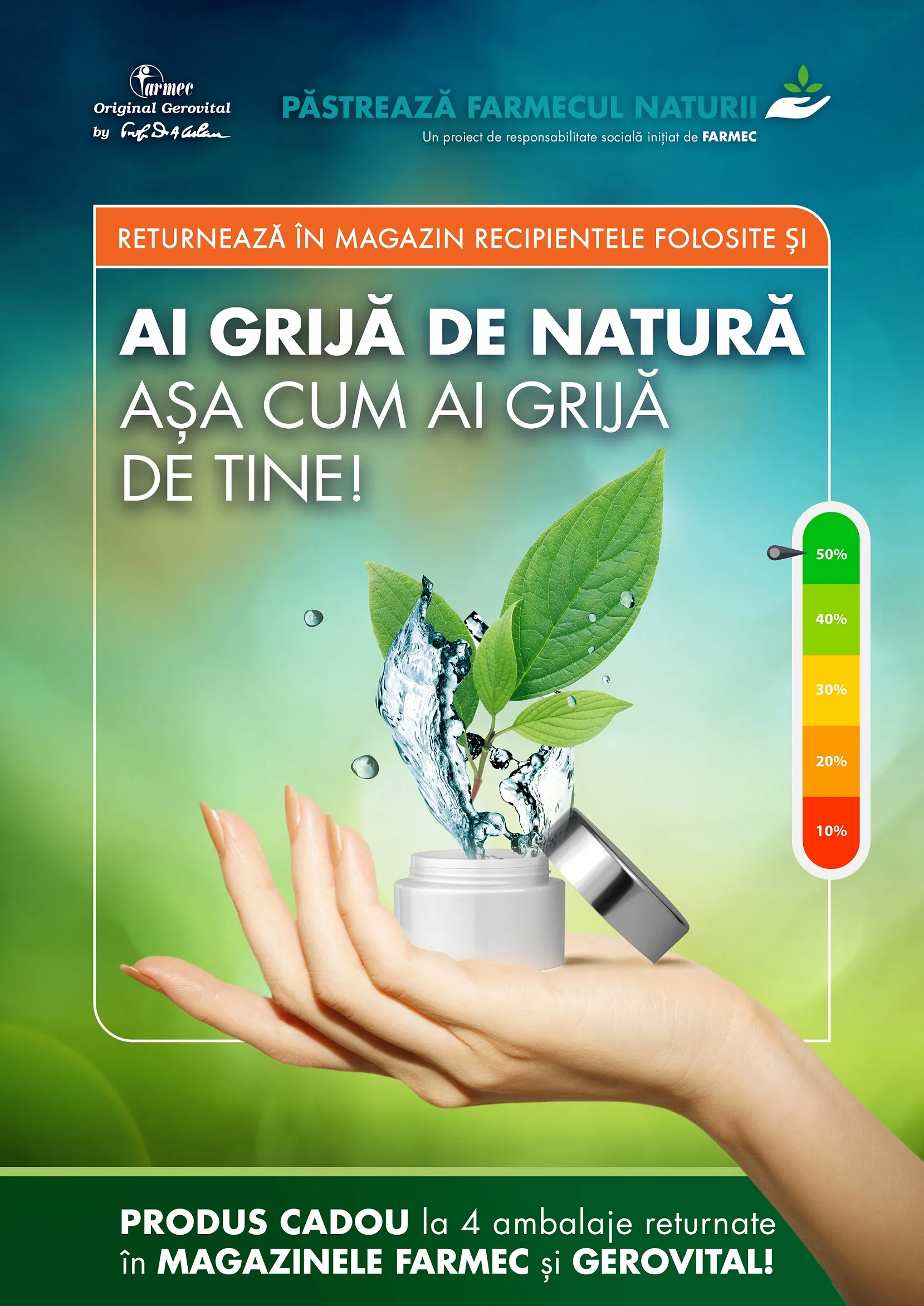 Farmec, cel mai mare producător român de cosmetice, extinde la nivel național, în toate magazinele proprii, campania de responsabilitate socială „Ai grijă de natură așa cum ai grijă de tine”. Începând cu luna aprilie, clienții vor putea recicla ambalajele din hârtie, plastic, sticlă și aluminiu ale produselor din portofoliul Farmec la punctele de colectare dedicate din magazinele Farmec și Gerovital din toată țara.