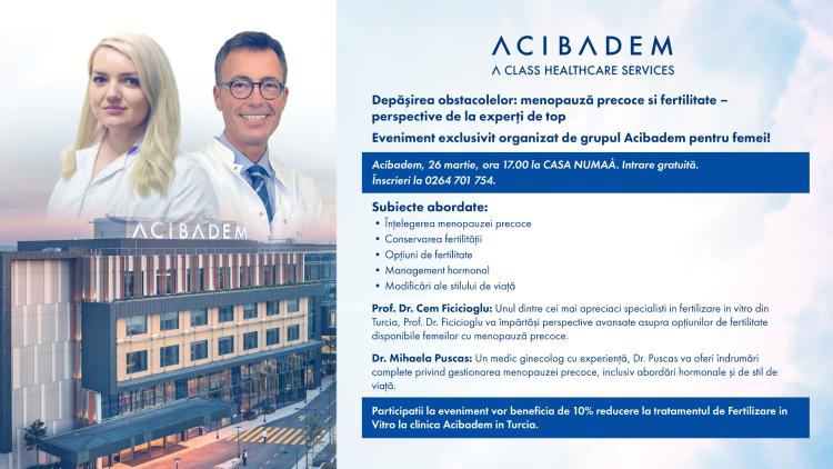 Femeile care se confruntă cu menopauza precoce au acum șansa de a afla informații valoroase și de a descoperi opțiuni moderne pentru fertilitate și echilibru hormonal. Acibadem, unul dintre cele mai prestigioase grupuri de spitale din Turcia, organizează un eveniment dedicat acestora, în premieră, la Cluj. Evenimentul, ce va avea loc pe 26 martie la Casa NUMAA, oferă femeilor oportunitatea de a învăța despre soluțiile disponibile pentru a-și păstra fertilitatea și sănătatea pe termen lung, având parte de consultanță directă de la experți internaționali.