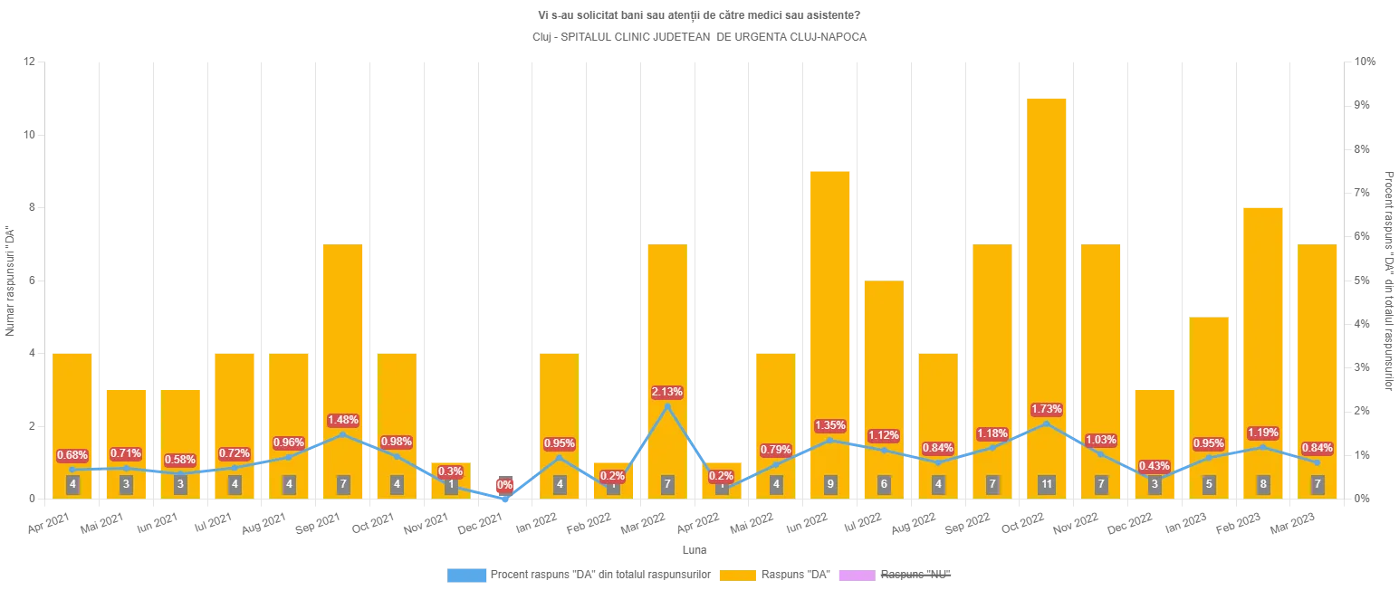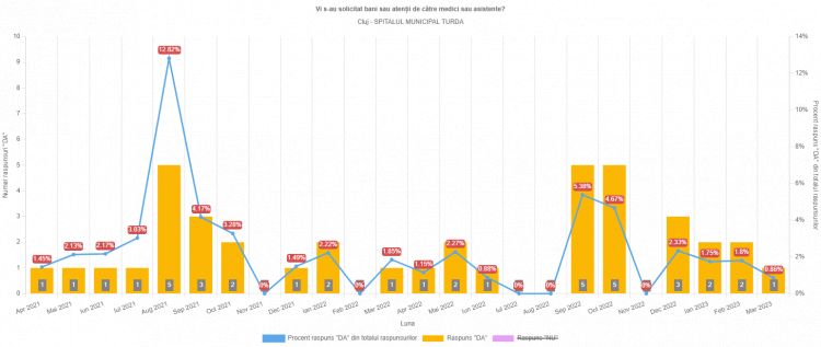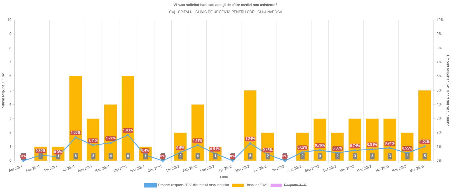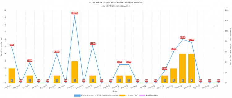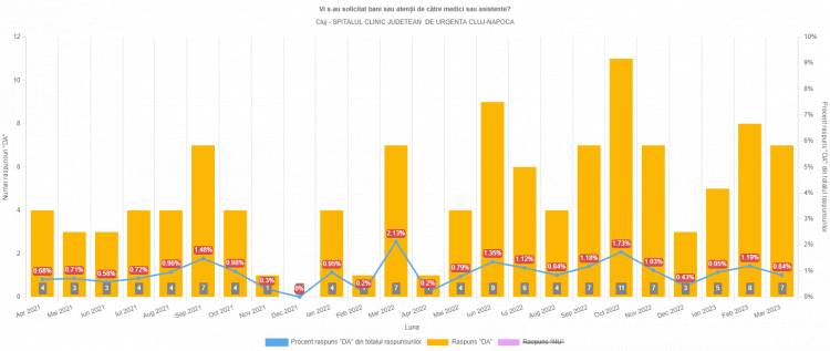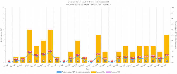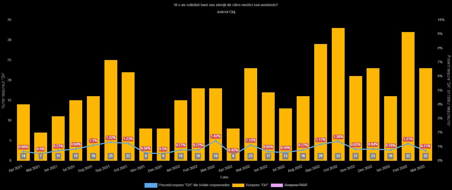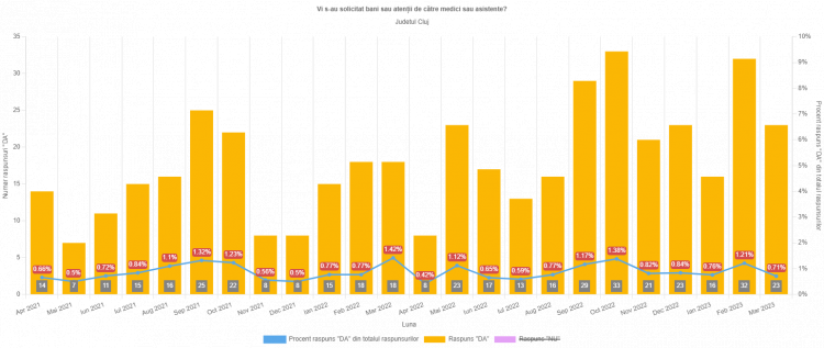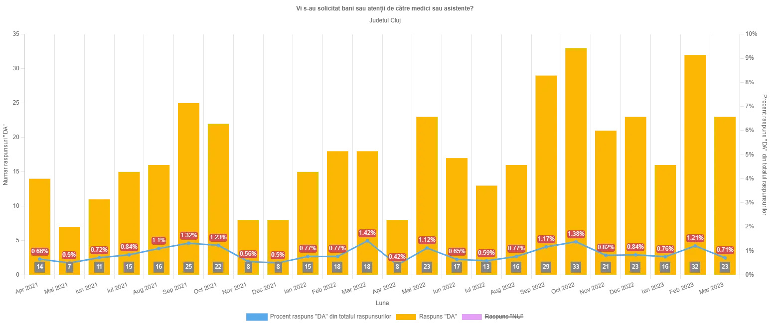 În luna martie, 3218 de persoane din Cluj au răspuns la întrebarea ”Vi s-au solicitat bani sau atenții de către medici sau asistente?”, din care 23 au spus ”DA”, iar 3195 ”NU”, adică un procent de 0,71%. În februarie, însă, la Cluj, 1,21% dintre pacienții chestionați au recunoscut că au dat bani medicilor sau asistentelor.