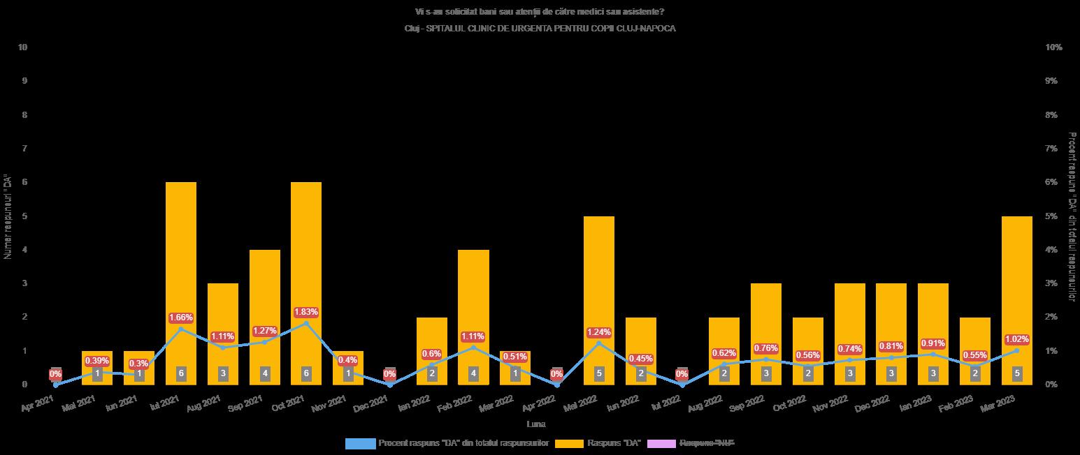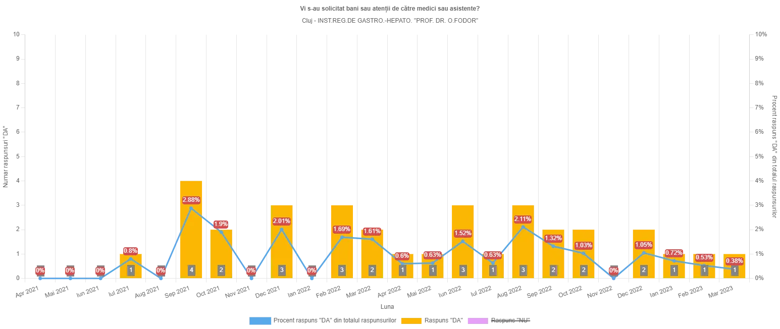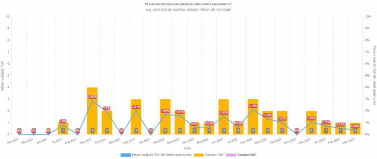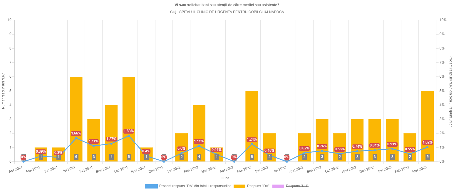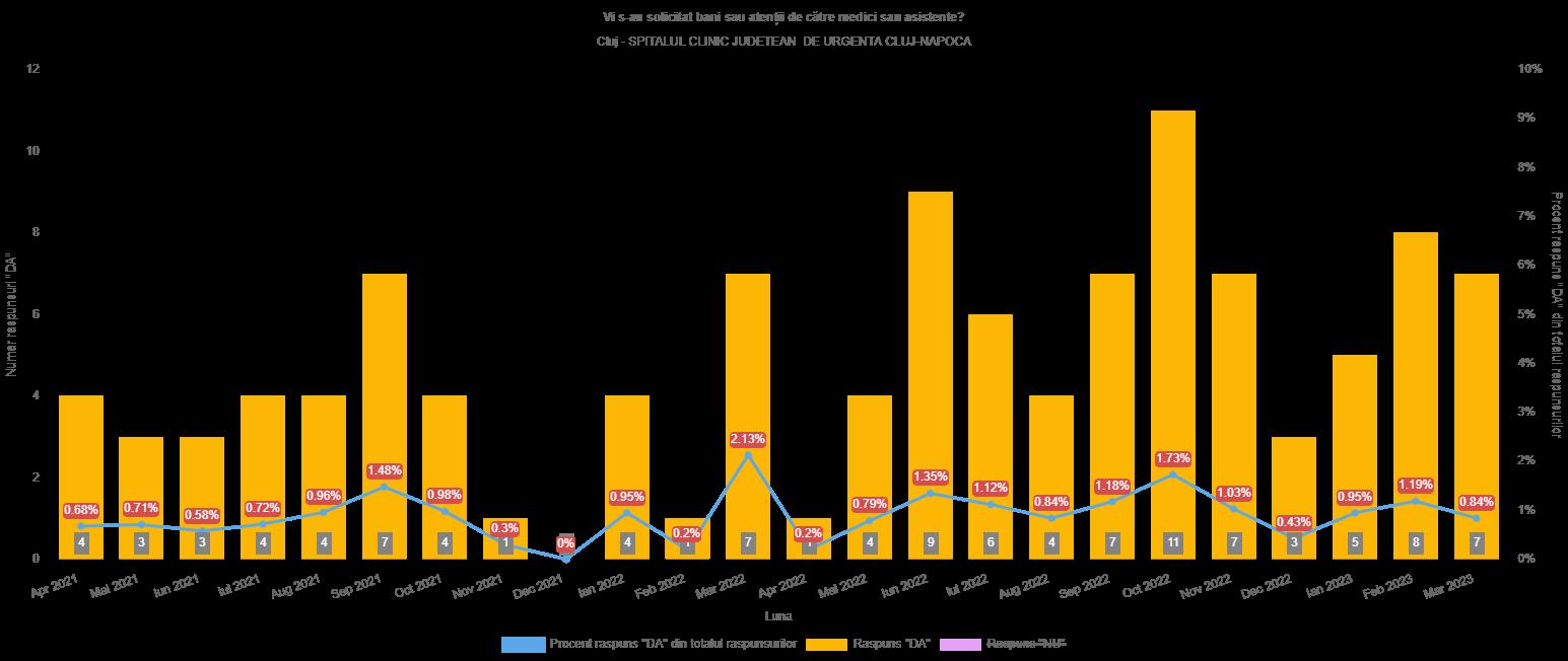 În luna martie, 3218 de persoane din Cluj au răspuns la întrebarea ”Vi s-au solicitat bani sau atenții de către medici sau asistente?”, din care 23 au spus ”DA”, iar 3195 ”NU”, adică un procent de 0,71%. În februarie, însă, la Cluj, 1,21% dintre pacienții chestionați au recunoscut că au dat bani medicilor sau asistentelor.