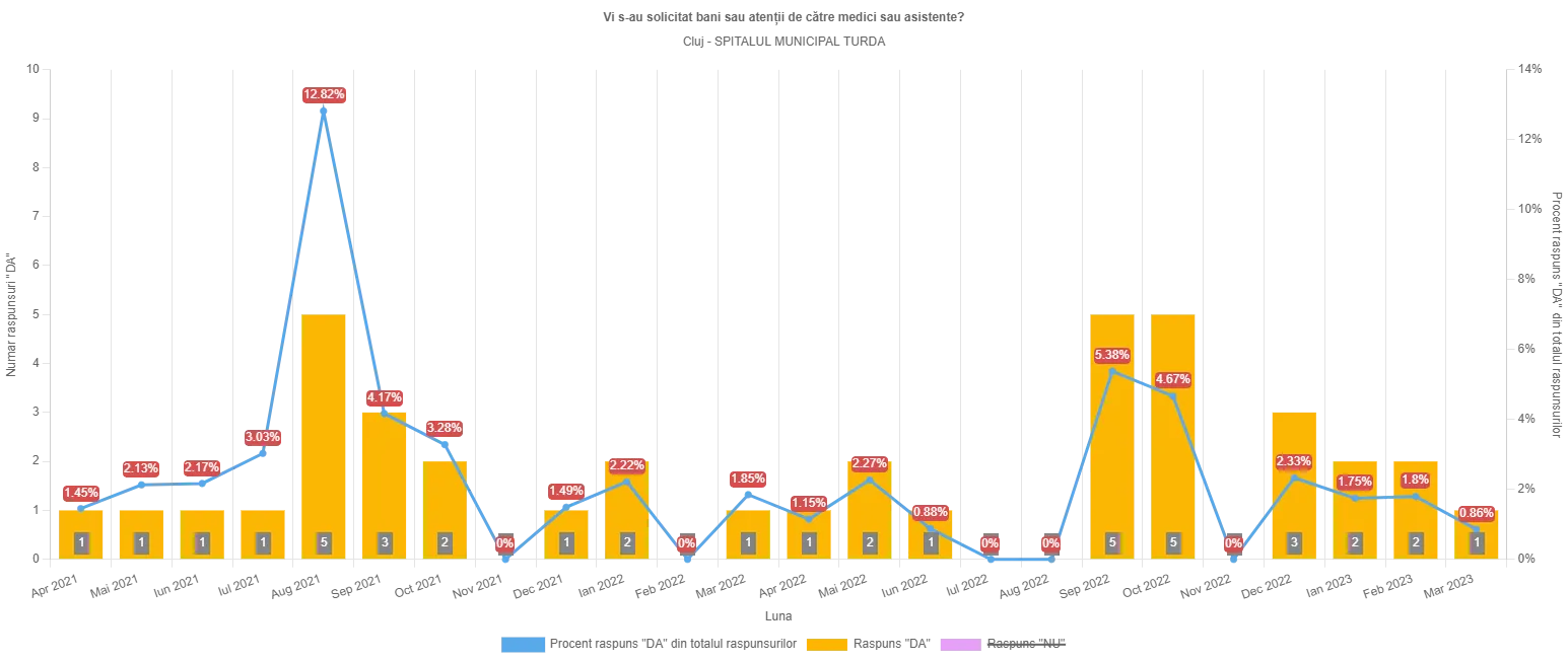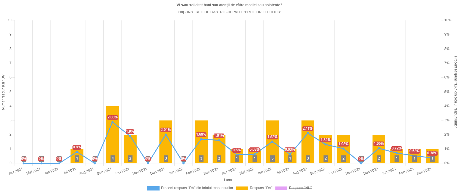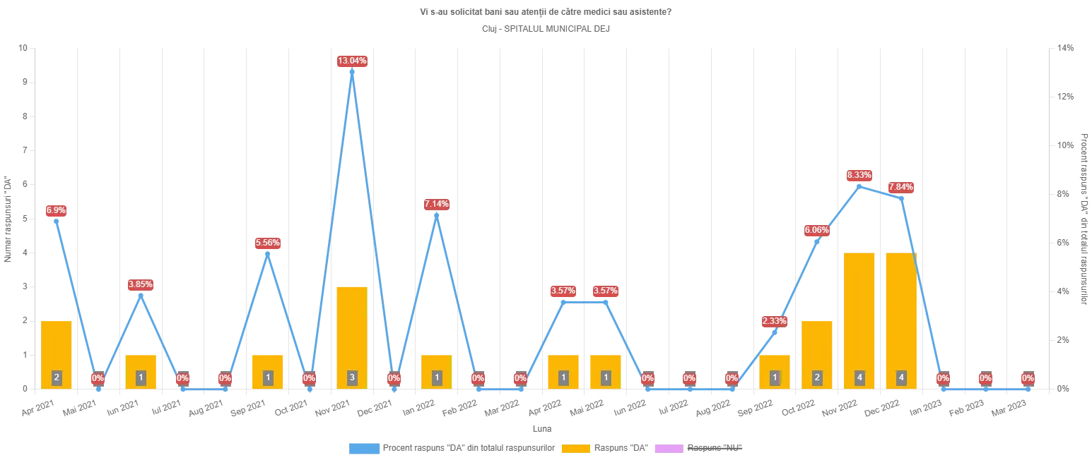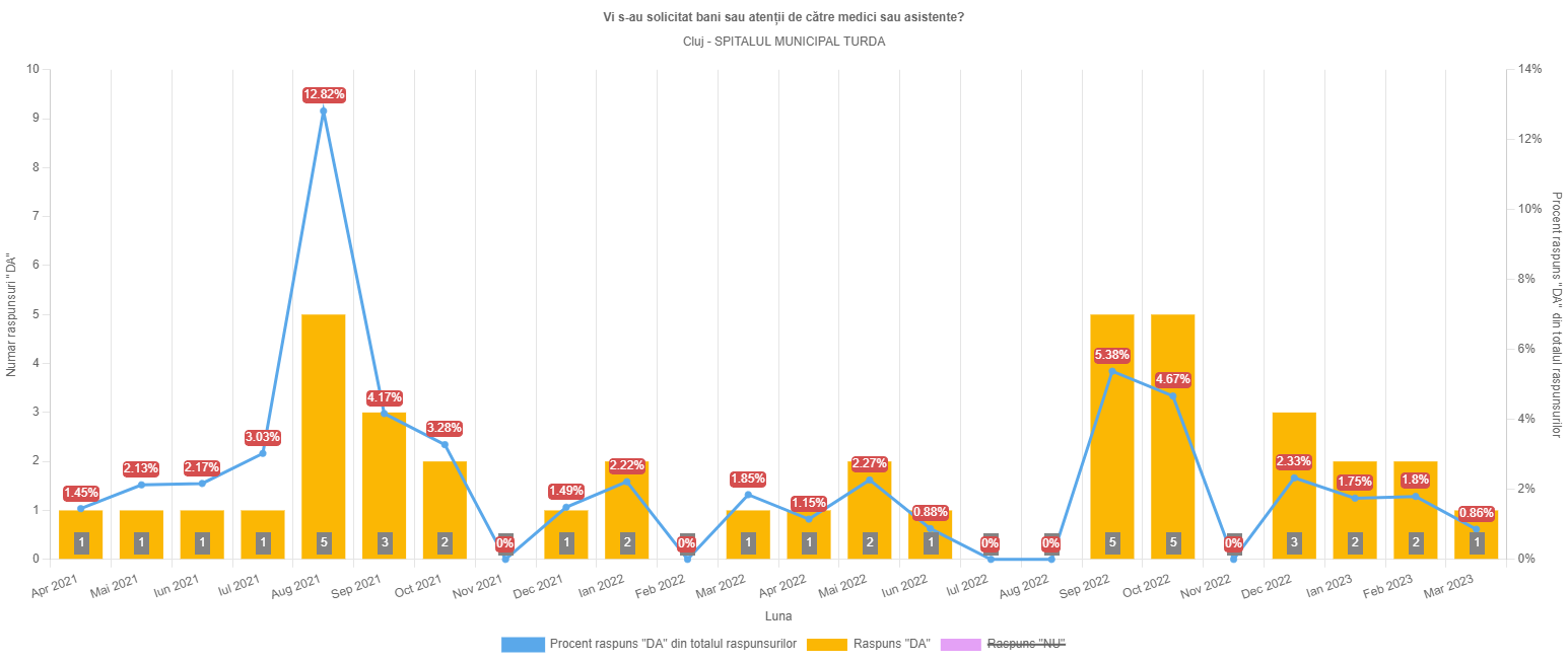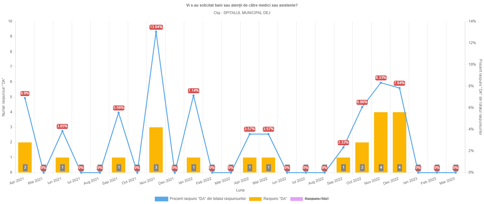 În luna martie, 3218 de persoane din Cluj au răspuns la întrebarea ”Vi s-au solicitat bani sau atenții de către medici sau asistente?”, din care 23 au spus ”DA”, iar 3195 ”NU”, adică un procent de 0,71%. În februarie, însă, la Cluj, 1,21% dintre pacienții chestionați au recunoscut că au dat bani medicilor sau asistentelor.