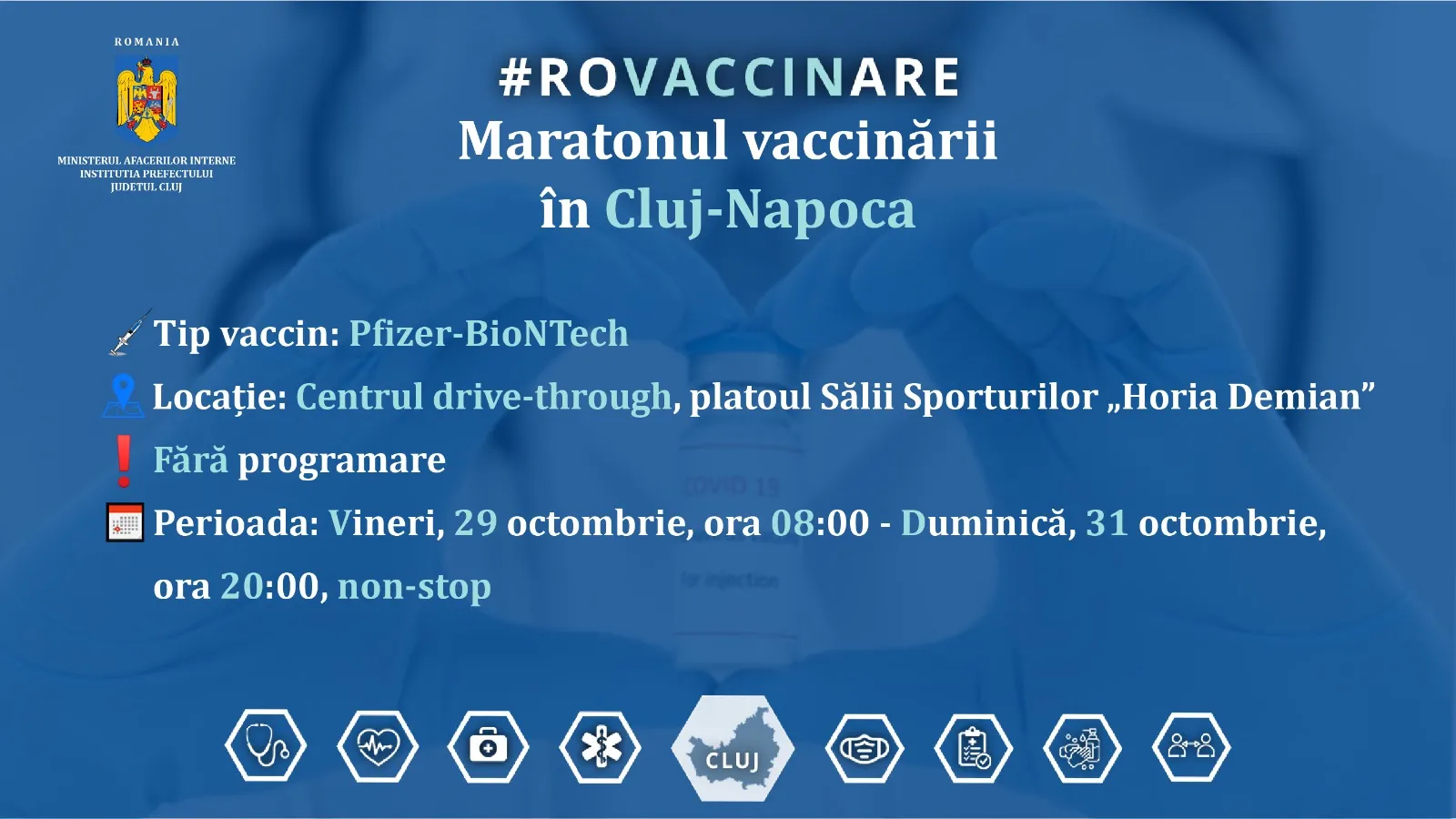 „În perioada 29 Octombrie, ora 08:00 până în 31 octombrie, ora 20:00, non-stop, locuitorii din Cluj-Napoca, dar și cei din alte localități, se vor putea vaccina cu tipul de vaccin Pfizer-BioNTech, fără programare, într-un maraton al vaccinării la centrul drive-through, de la Sala Sportului ,, Horia Demian”, Cluj-Napoca.