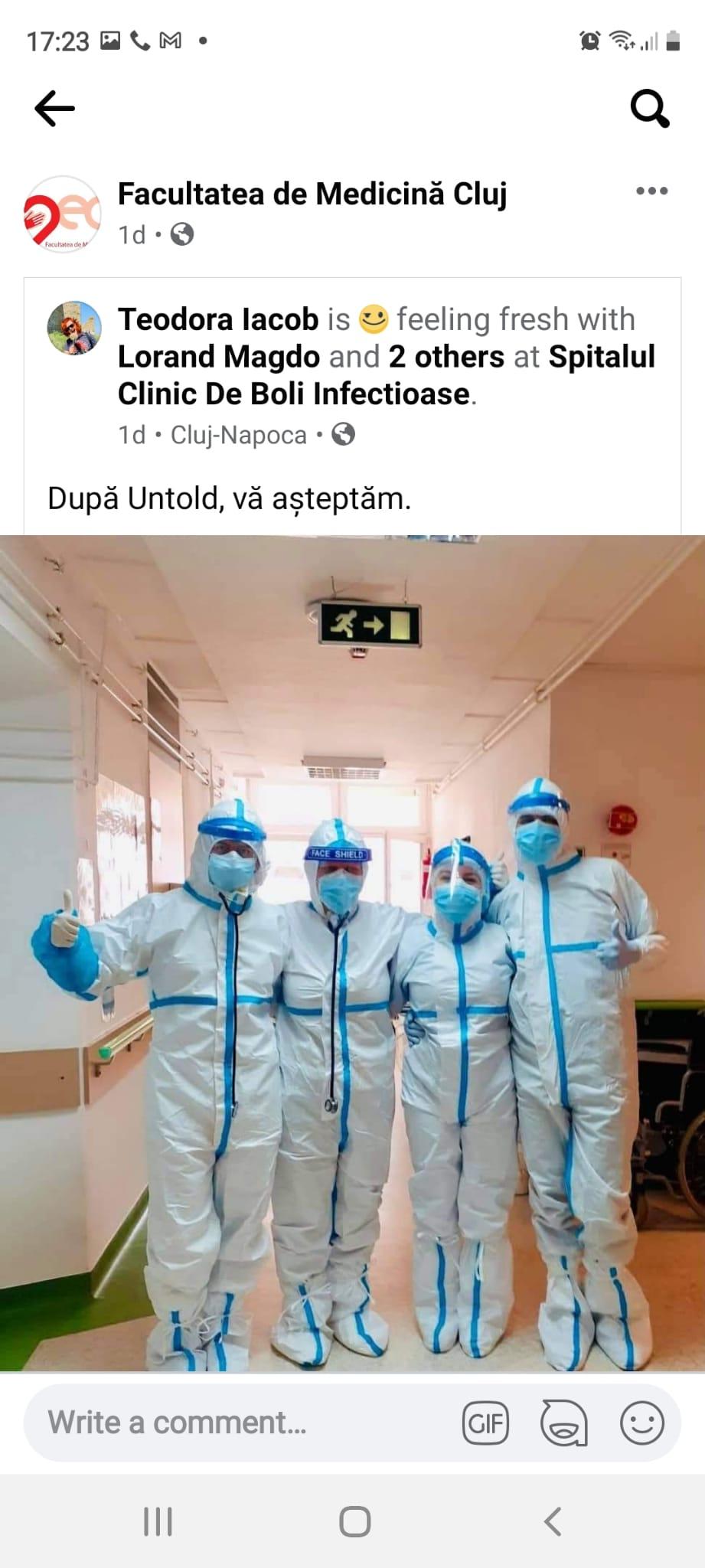 Medicul clujean a ilustrat mesajul de pe Facebook cu o fotografie în care apare alături de alți colegi, medici și asistete, echipate în combinezoane de protecție. Medicul Teodora Iacob a mai comentat că la spital sunt ”cele mai faine costume de la Untold. Se numesc combinezoane” și că se oferă și brățări, ca la festivaluri.