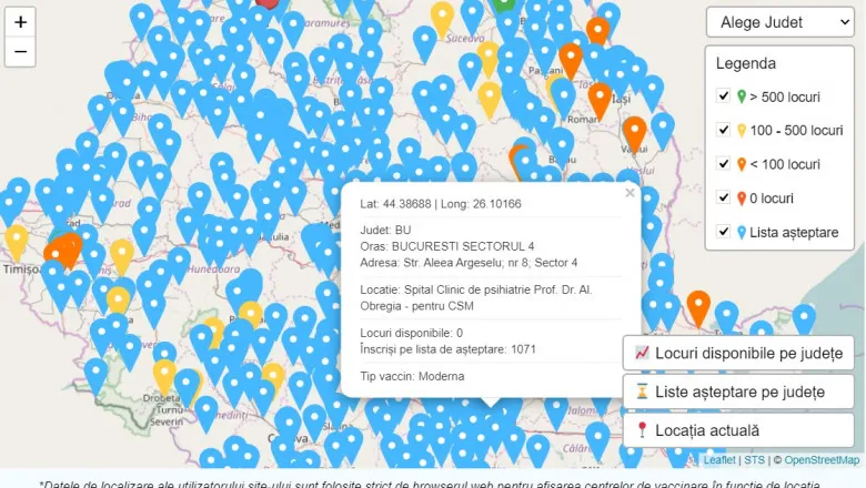 Harta cuprinde toate centrele de vaccinare active în platformă, tipul vaccinului administrat în acestea, numărul locurilor disponibile și numărul persoanelor înscrise pe lista de așteptare.