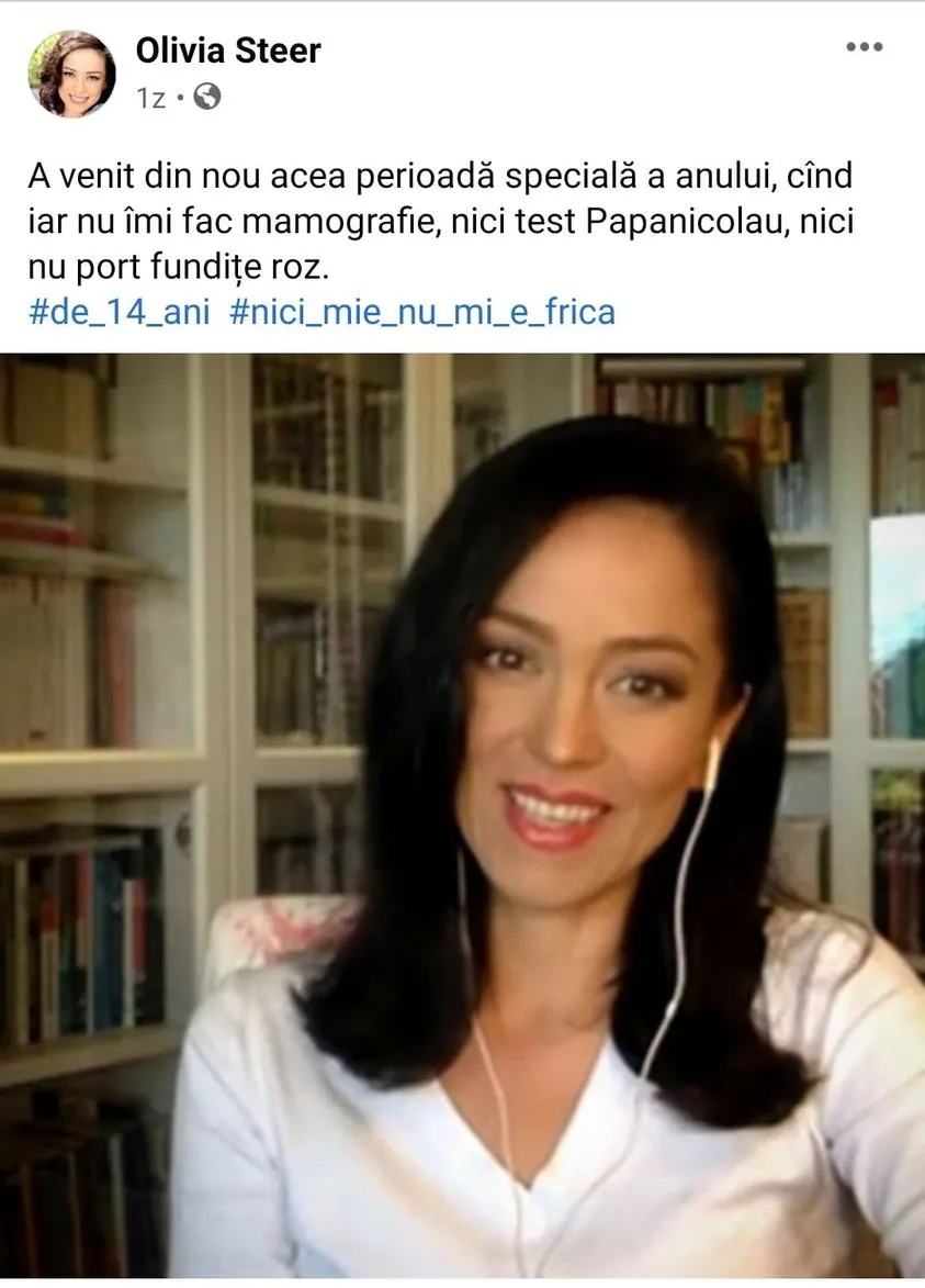 Olivia Steer, antivaccinistă convinsă, a scris un mesaj prin care anunța că a venit iarăși acea perioadă din an când nu își face mamografie, nici test Papanicolau și nici nu poartă fundiță roz.