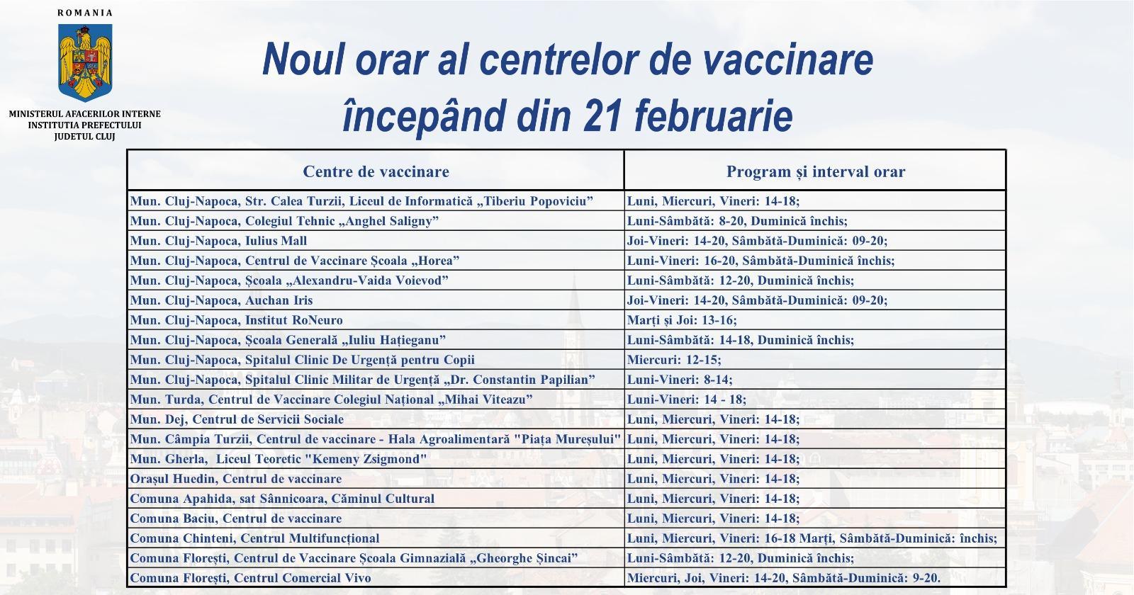 Centrele de vaccinare împotriva COVID-19 din județul Cluj au, începând de astăzi, un nou orar de funcționare, doar câteva urmând să fie deschise și în weekend.