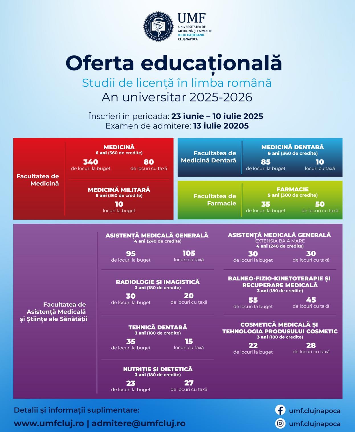 În total, pentru anul universitar 2025–2026, UMF scoate la concurs 1.200 de locuri la programele de licență în limba română, dintre care:
