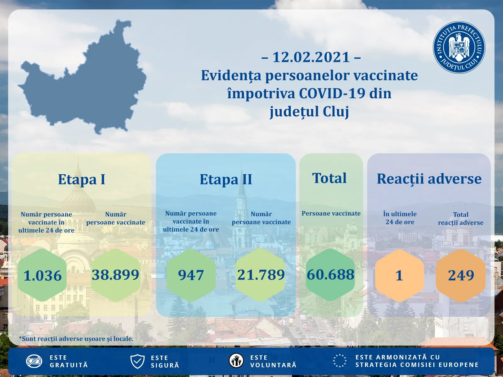În prima etapă, când au fost imunizate cadrele medicale, s-a ajuns la 38.899 persoane imunizate, iar în etapa a doua la 21.789 persoane. În total, 60.688 persoane s-au imunizat la Cluj.