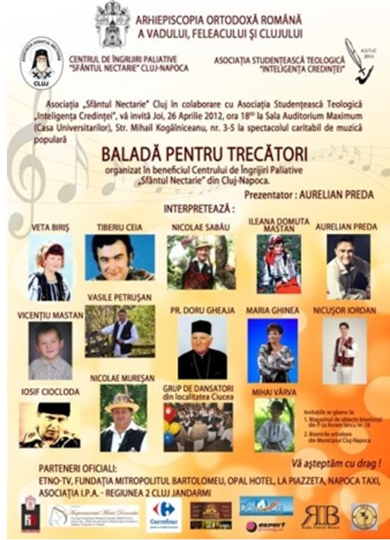 "Balada pentru trecatori", concert de muzica populara organizat la Cluj de Asociatia "Sfantul Nectarie", joi, 26 aprilie
