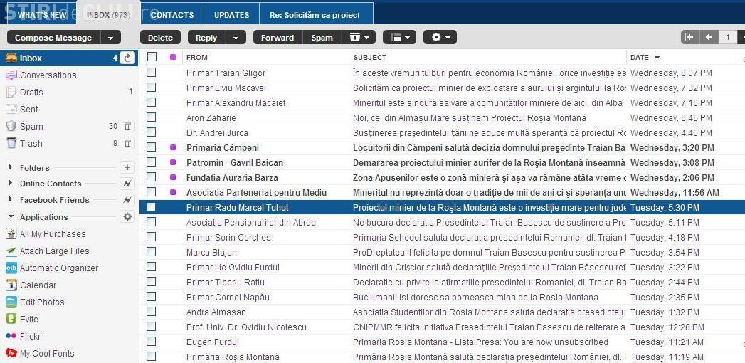Un clujean care a semnalat situatia a precizat ca doua zile, marti si miercuri, a primit 21 de mailuri din partea unor entitati de stat sau private care salutau declaratia lui Basescu. "Cianuratii mi-au poluat e-mailul cu mesaje de sustinere a proiectului. Nu reusesc sa mai scap de ei", ne-a scris Florin Farcas.