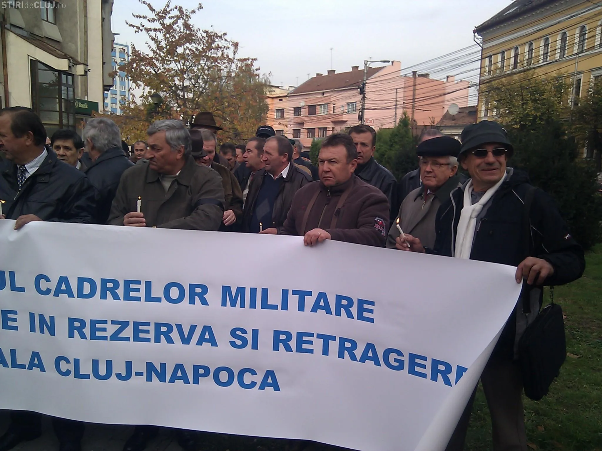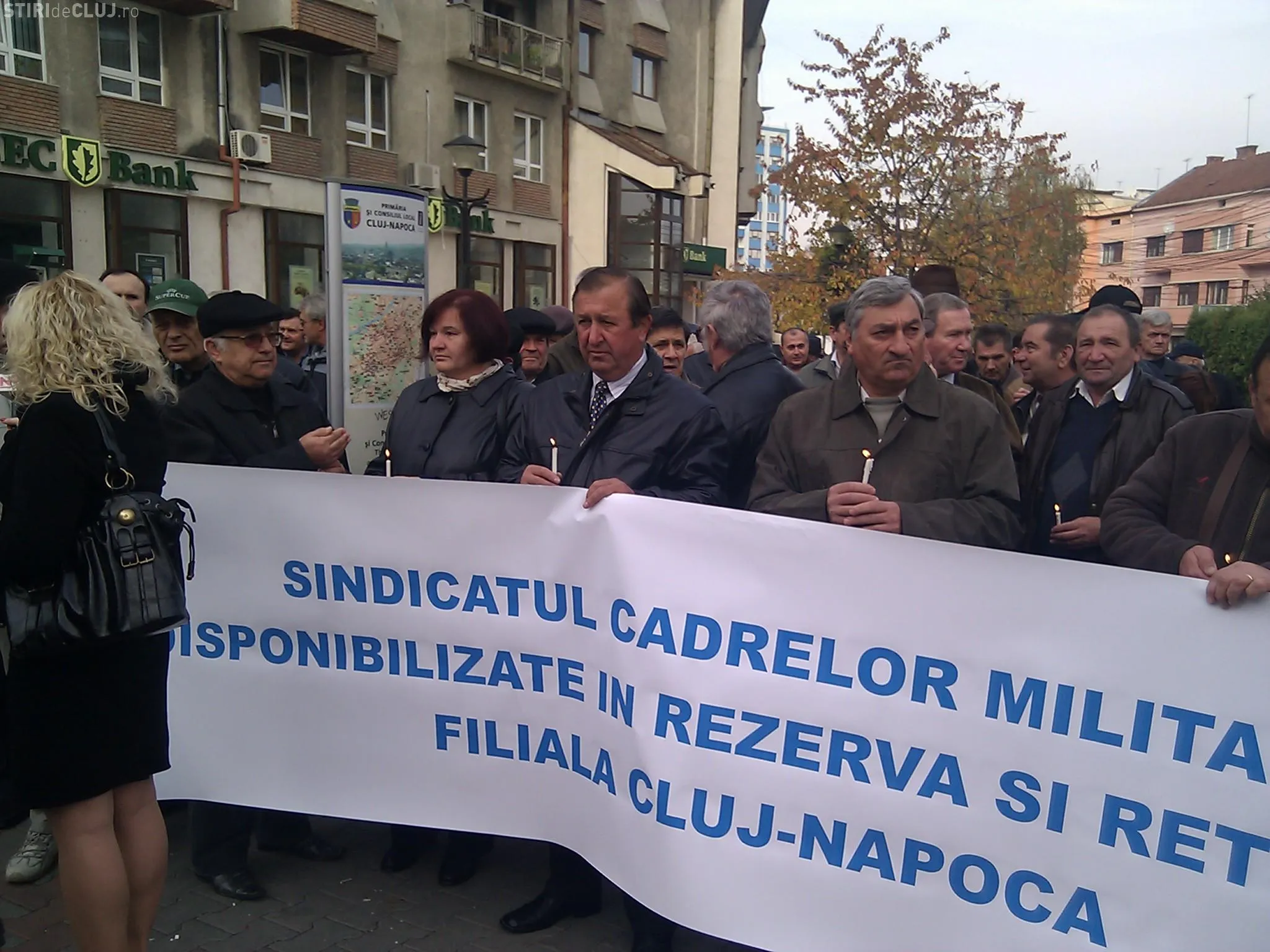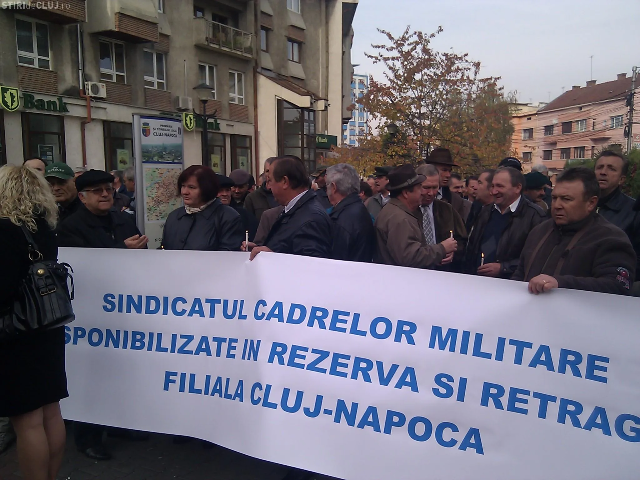 Ofiterii in rezerva s-au adunat in fata Prefecturii Cluj pentru a cere autoritatilor anularea ordonantei privind recalcularea pensiilor. Protestatarii, membrii ai Asociatiei Cadrelor Militare in Rezerva, au aprins lumanari si au adus o coroana, pentru a le arata autoritatilor, ca pentru ei, actualul Guvern este mort.