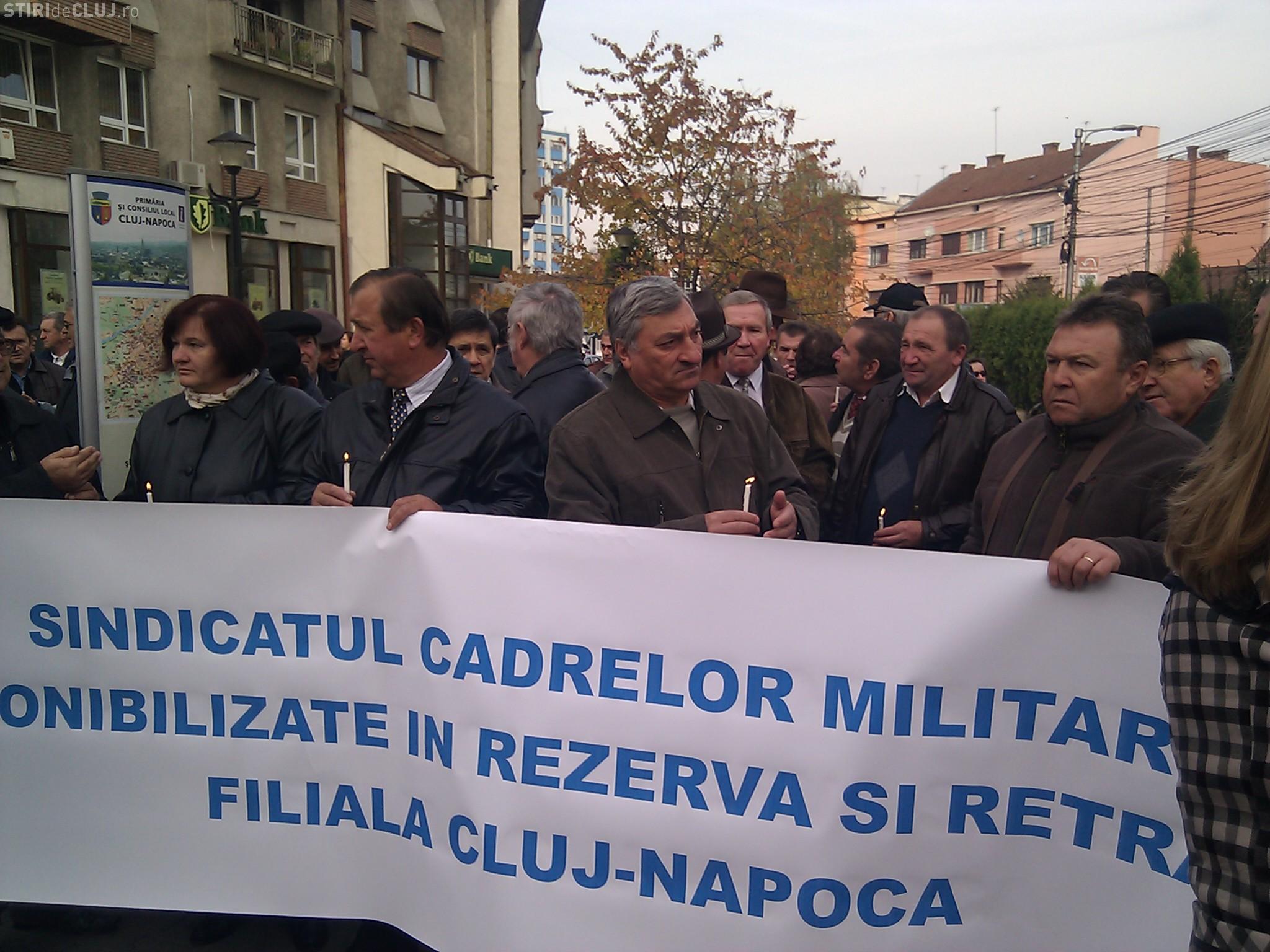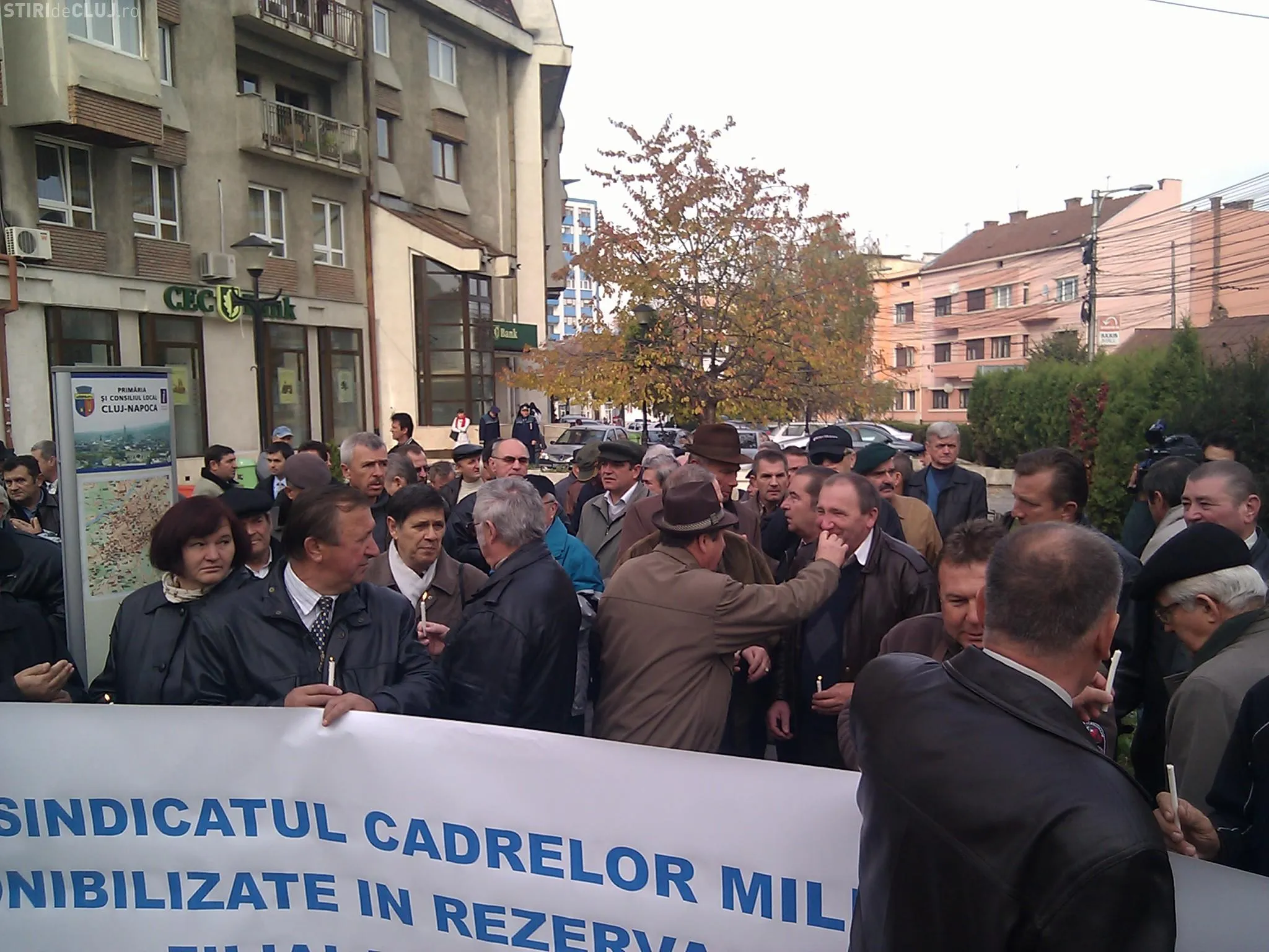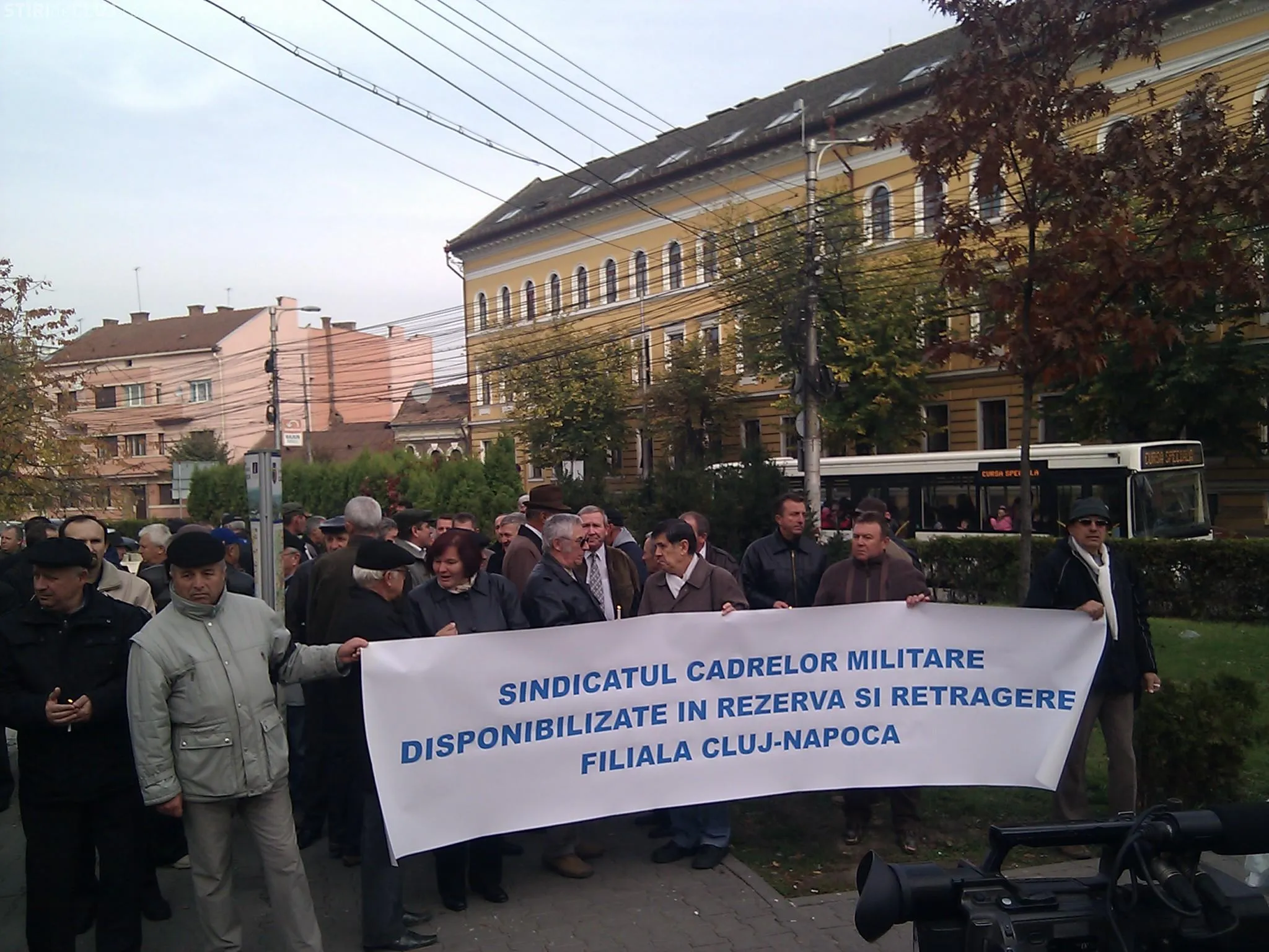 Ofiterii in rezerva s-au adunat in fata Prefecturii Cluj pentru a cere autoritatilor anularea ordonantei privind recalcularea pensiilor. Protestatarii, membrii ai Asociatiei Cadrelor Militare in Rezerva, au aprins lumanari si au adus o coroana, pentru a le arata autoritatilor, ca pentru ei, actualul Guvern este mort.
