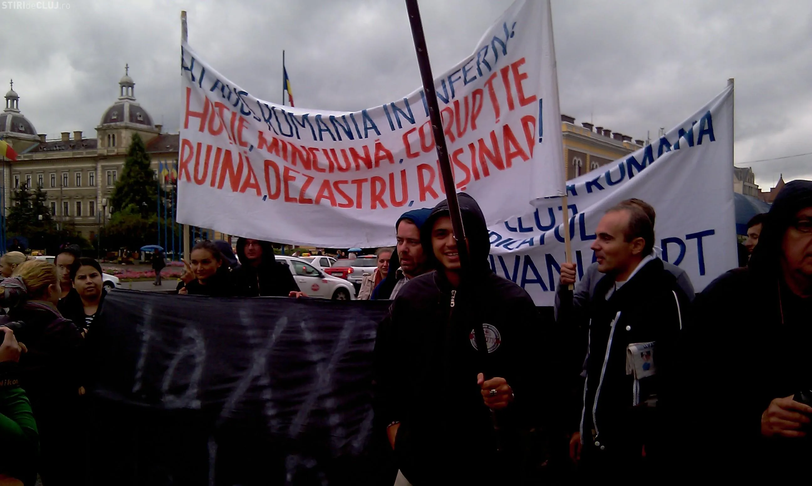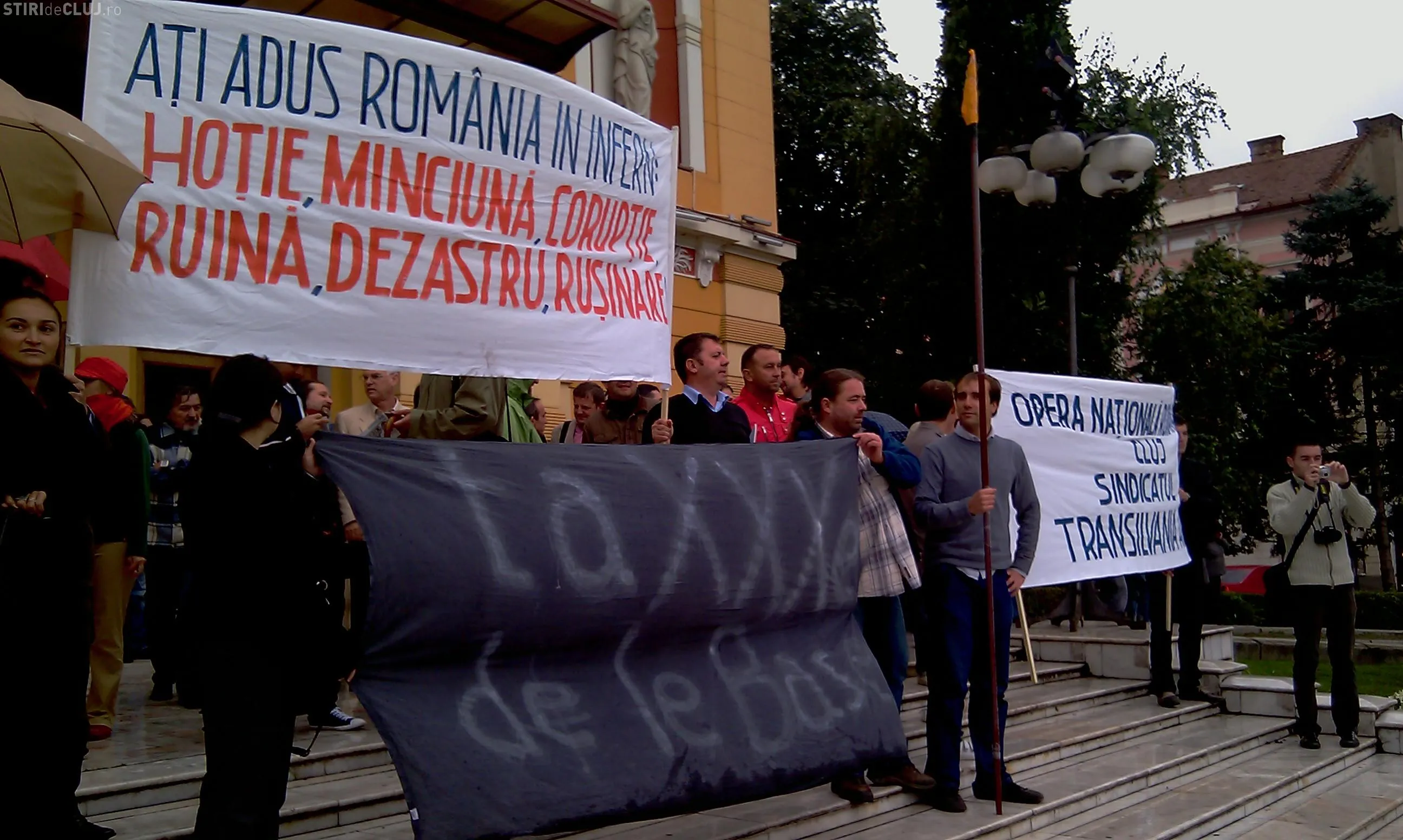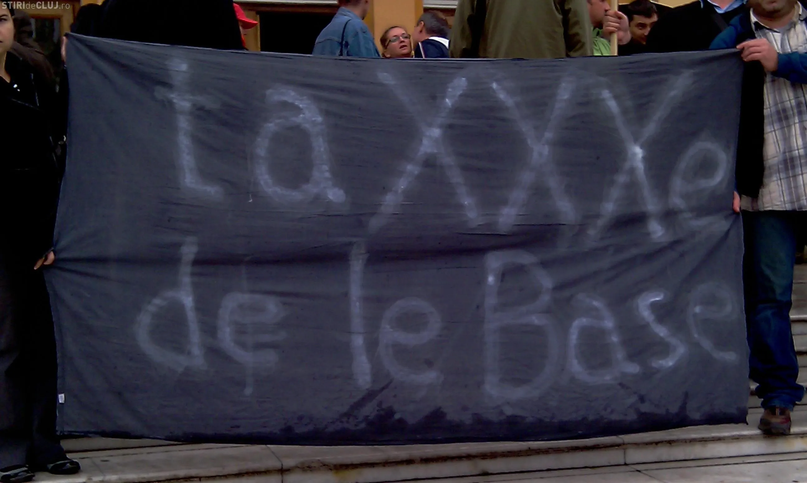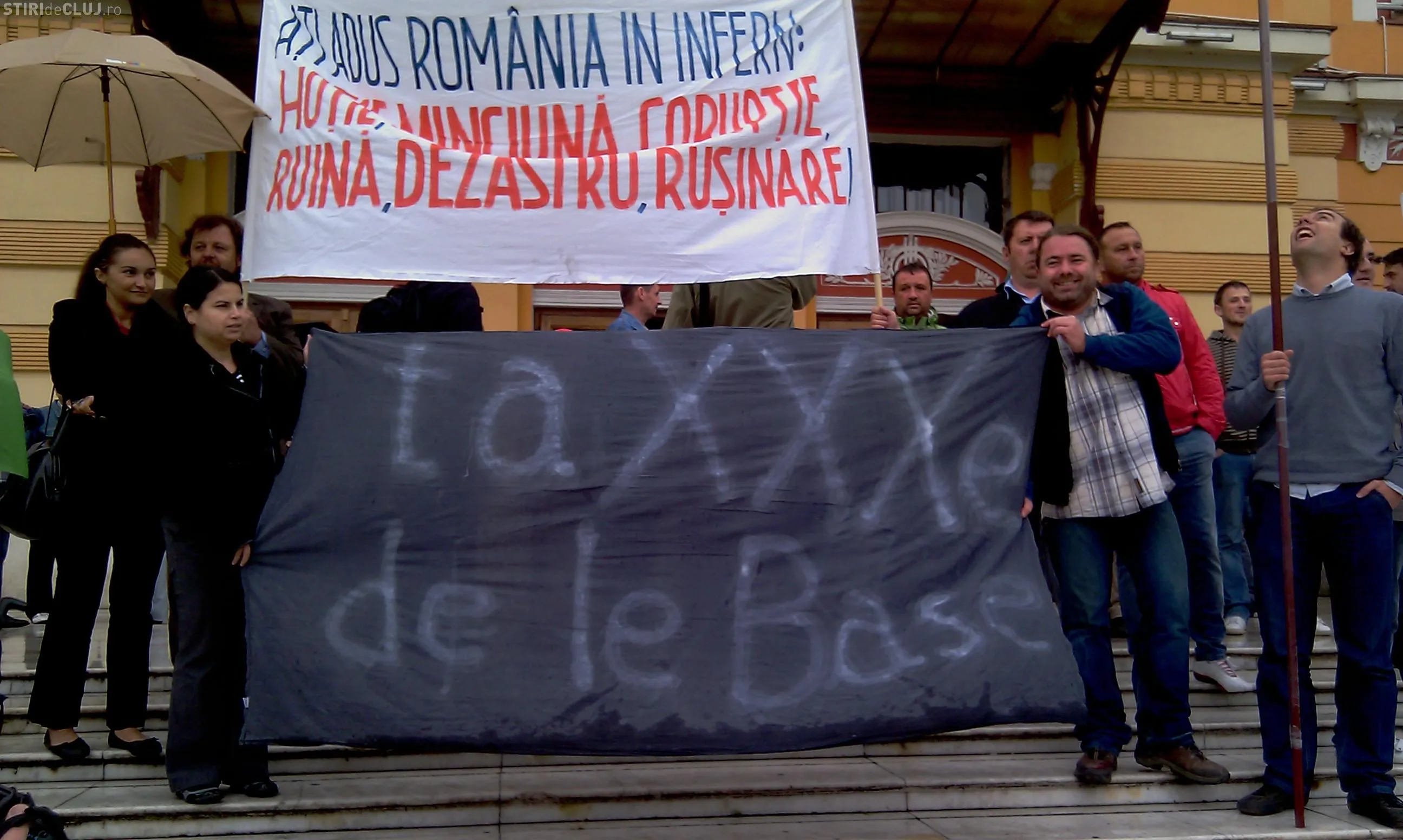 Cei 100 de protestatari s-au strans in fata Teatrului National din Cluj, in jurul orei 12.00. Ei au afisat doua bannere cu mesajele: "Ati adus Romania in infern, in hotie, minciuna, coruptie, ruina, dezastru si rusinare" si "TaXXXe de la Base".