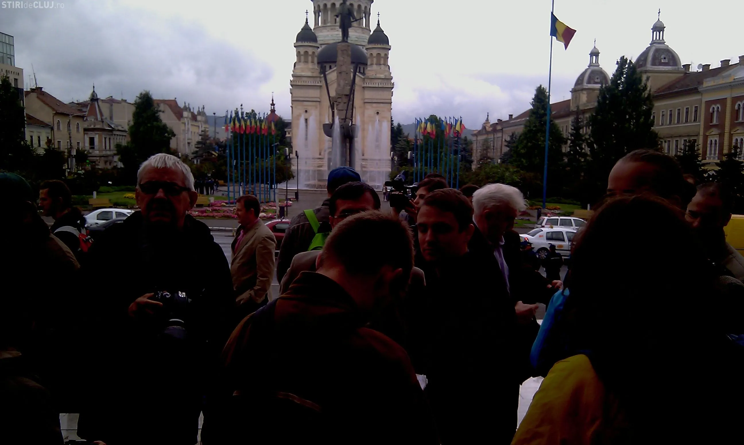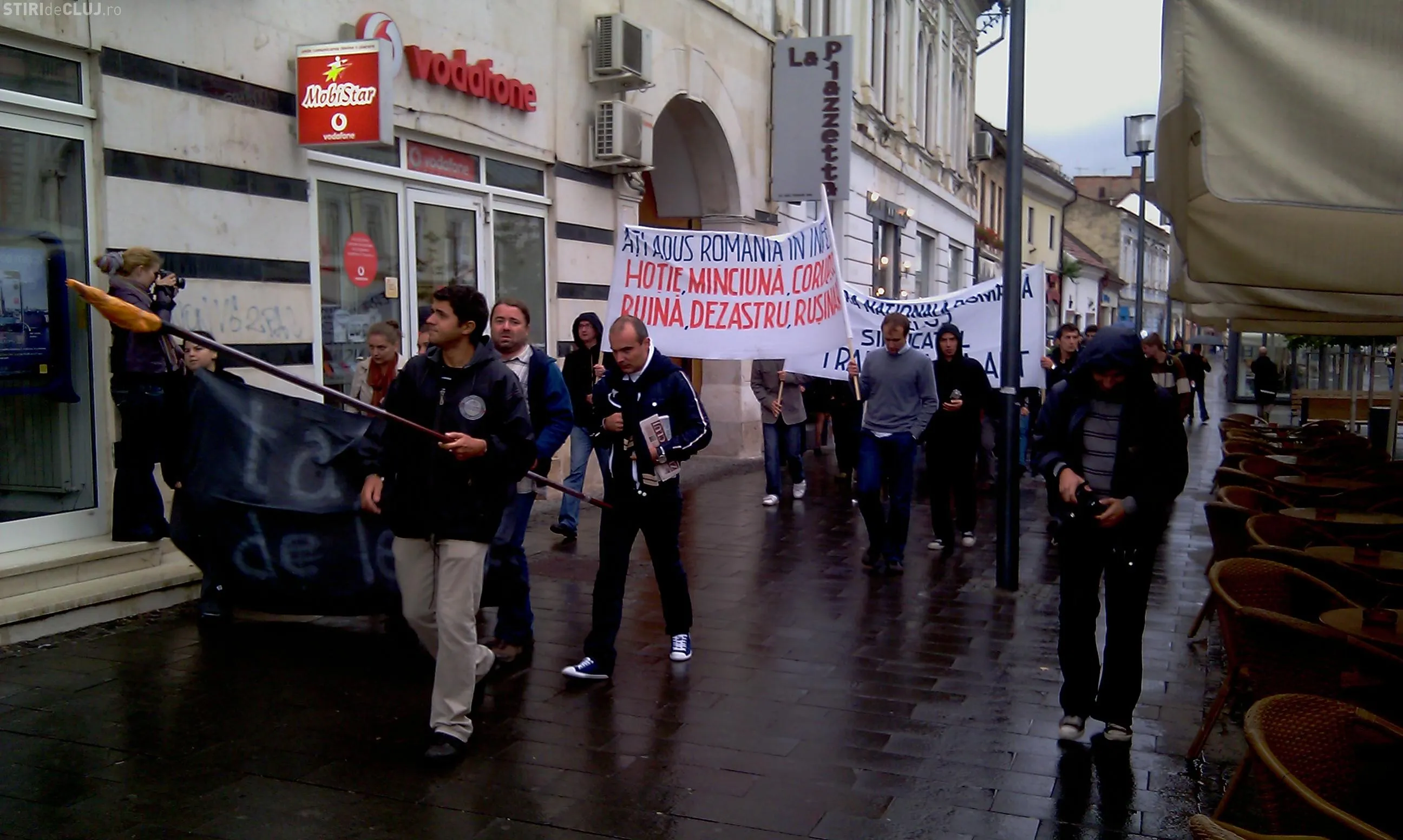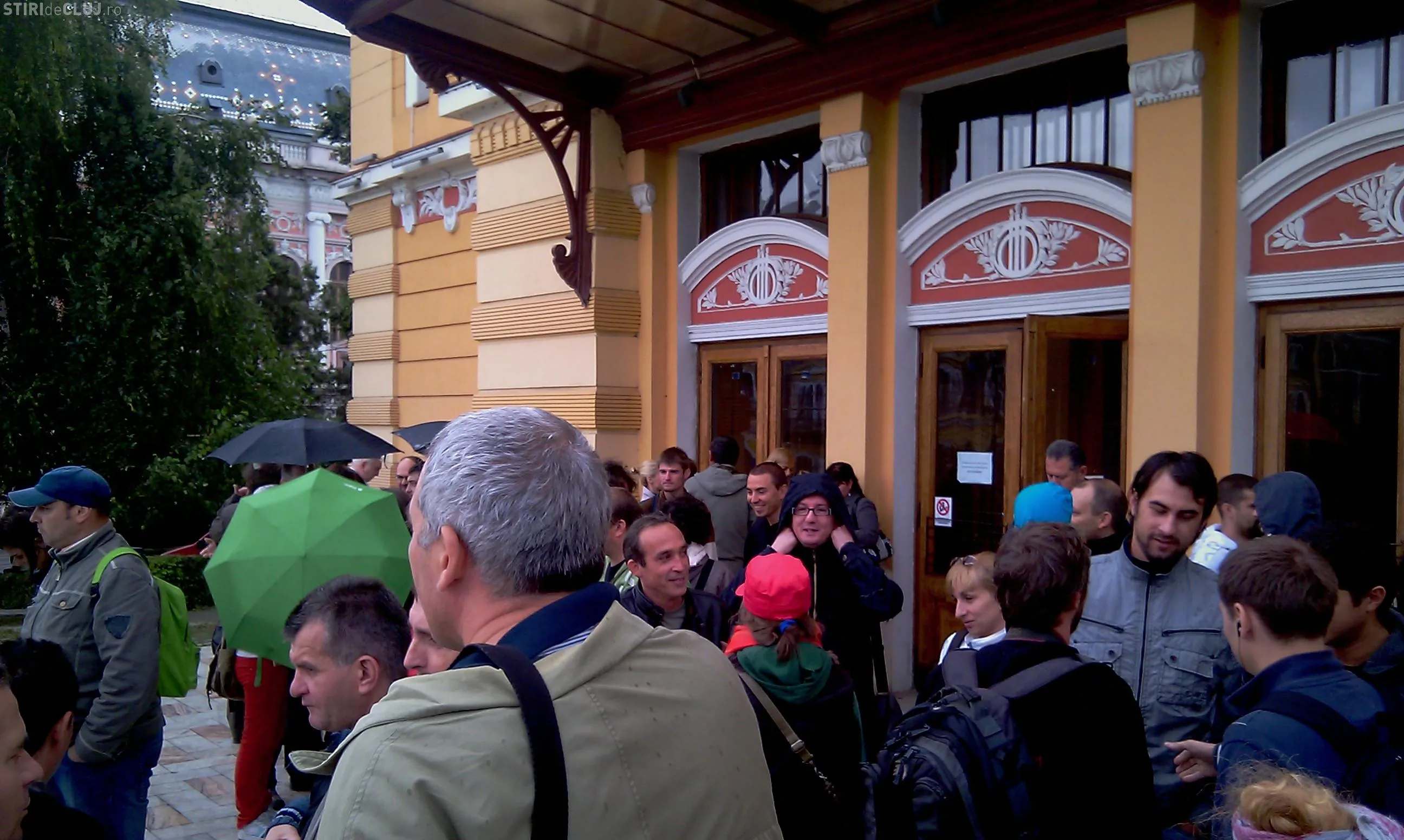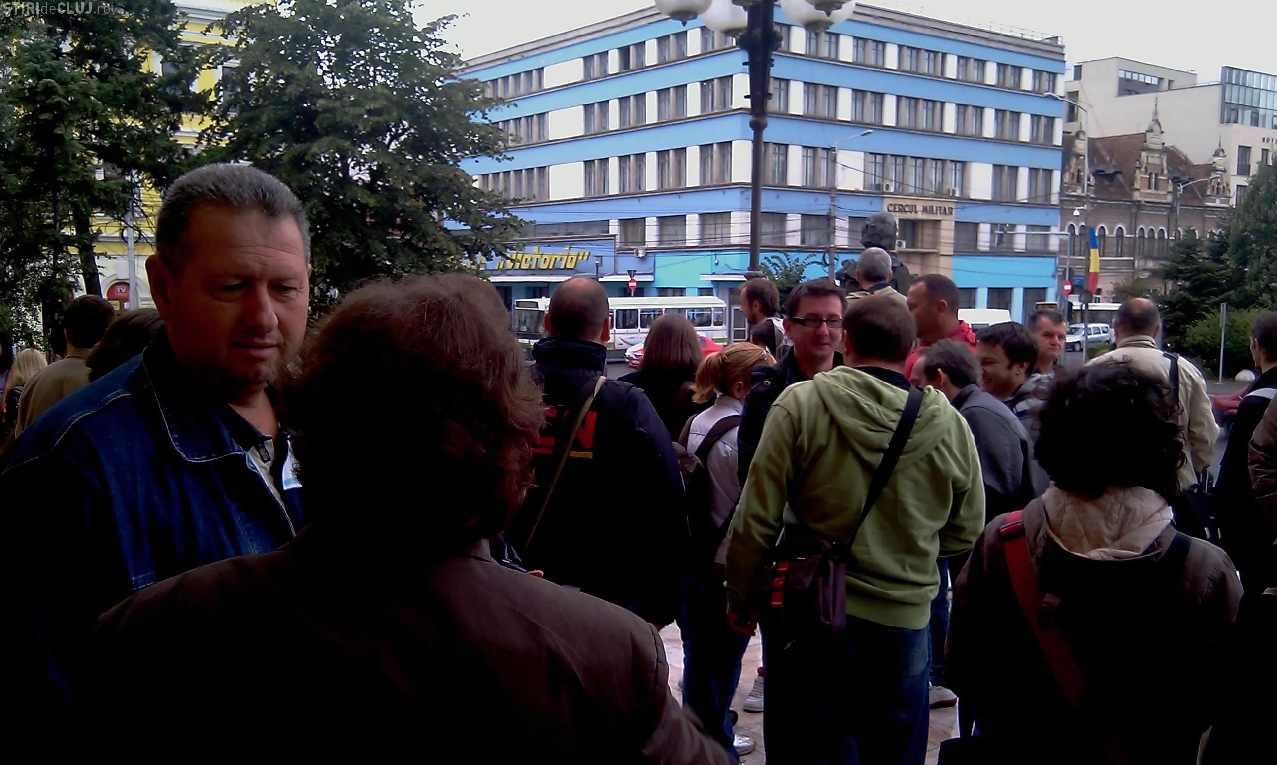 Cei 100 de protestatari s-au strans in fata Teatrului National din Cluj, in jurul orei 12.00. Ei au afisat doua bannere cu mesajele: "Ati adus Romania in infern, in hotie, minciuna, coruptie, ruina, dezastru si rusinare" si "TaXXXe de la Base".