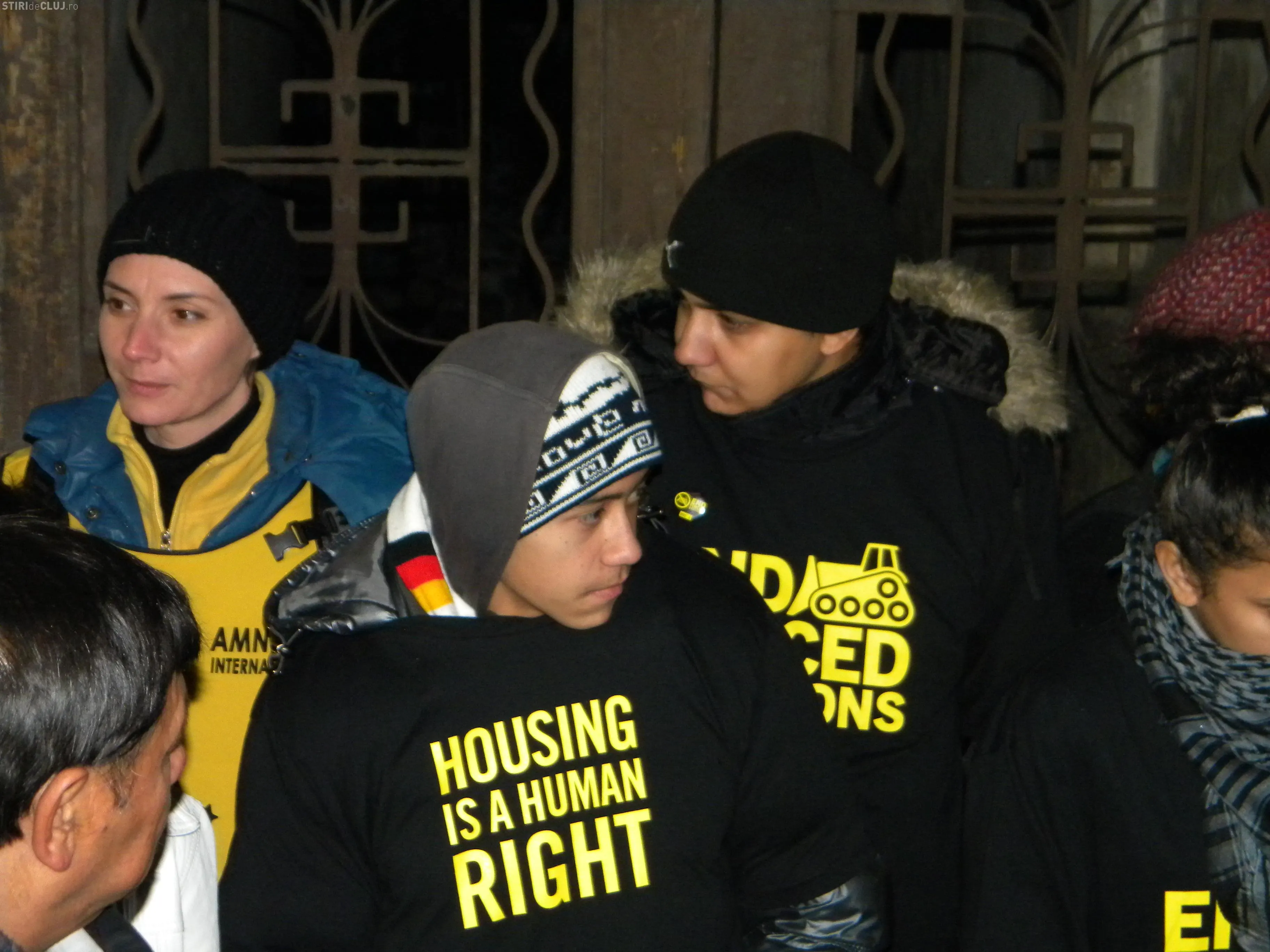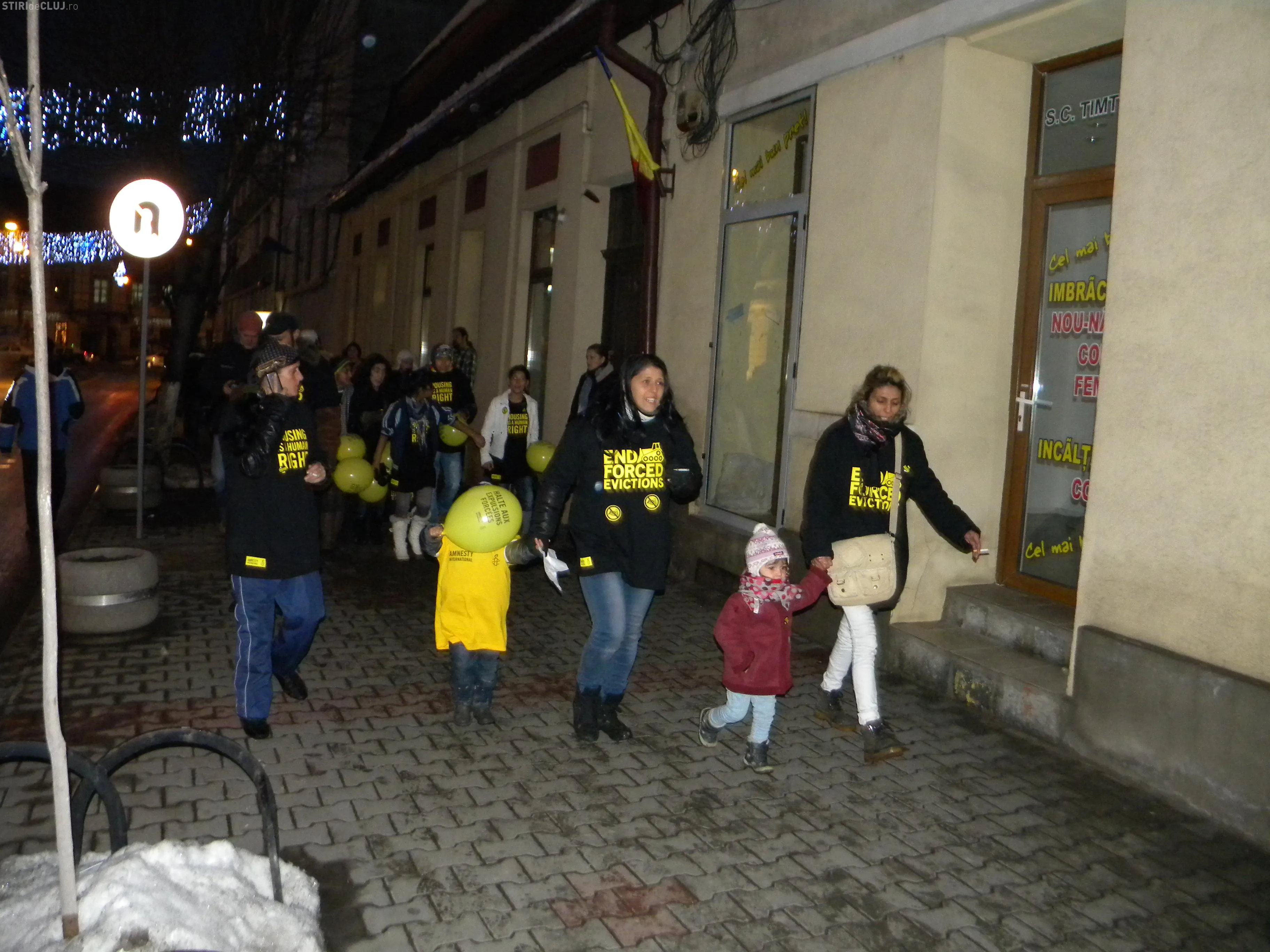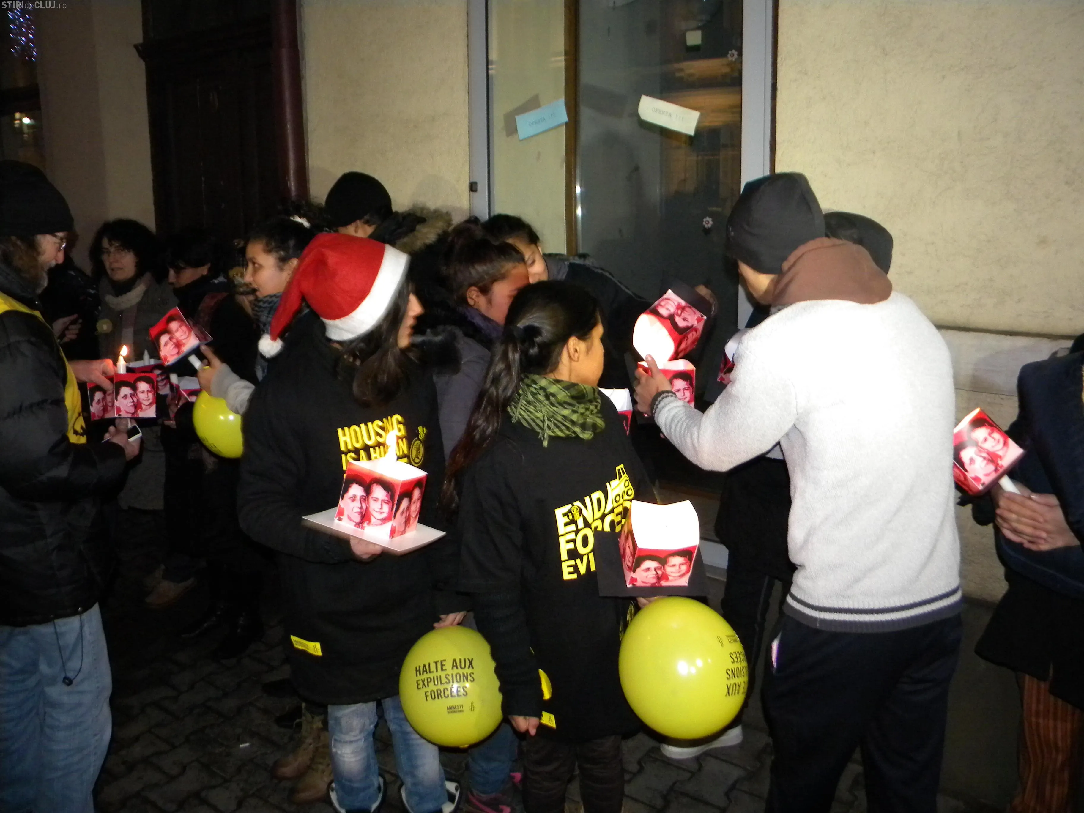 Protestatarii, circa 100 de țigani care locuiesc la Pata Rât în case de tip container, și alții 100 de activiști din Cluj-Napoca, dar și din străinătate de la Amnesty International, au format un lanț uman în jurul Primăriei, au aprins lumânări pe care, la final, le-au lăsat în fața clădirii municipalității.