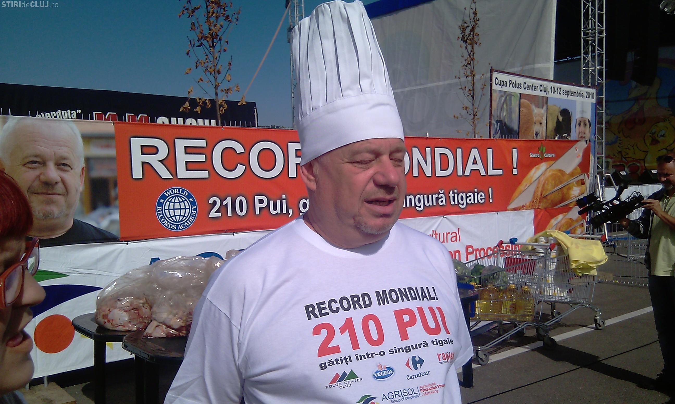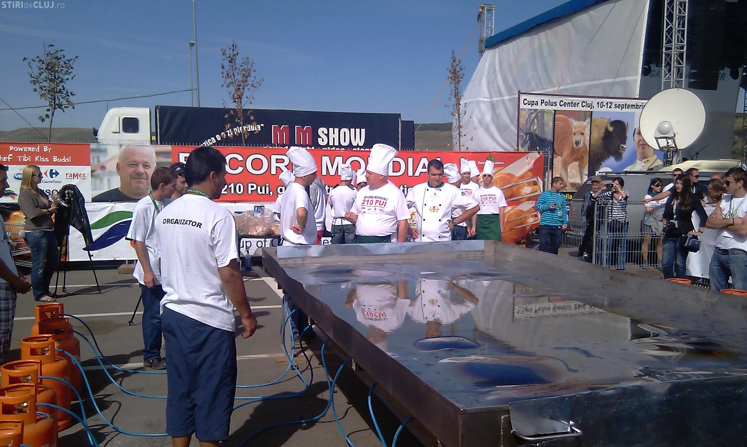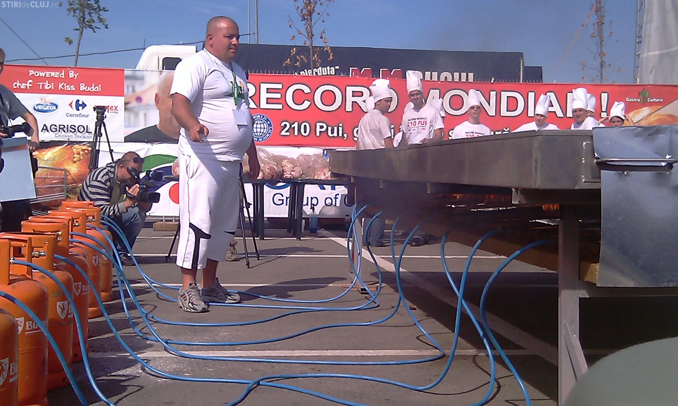 Clujeanul Tibi Kiss Budai spera sa doboare astazi recordul mondial si sa prajeasca 210 pui intr-o tigaie de 15 metri patrati. De la ora 11.00 au fost pregatite mirodeniile si acum este asteptat juriul pentru ca bucatarul sa treaca la treaba.