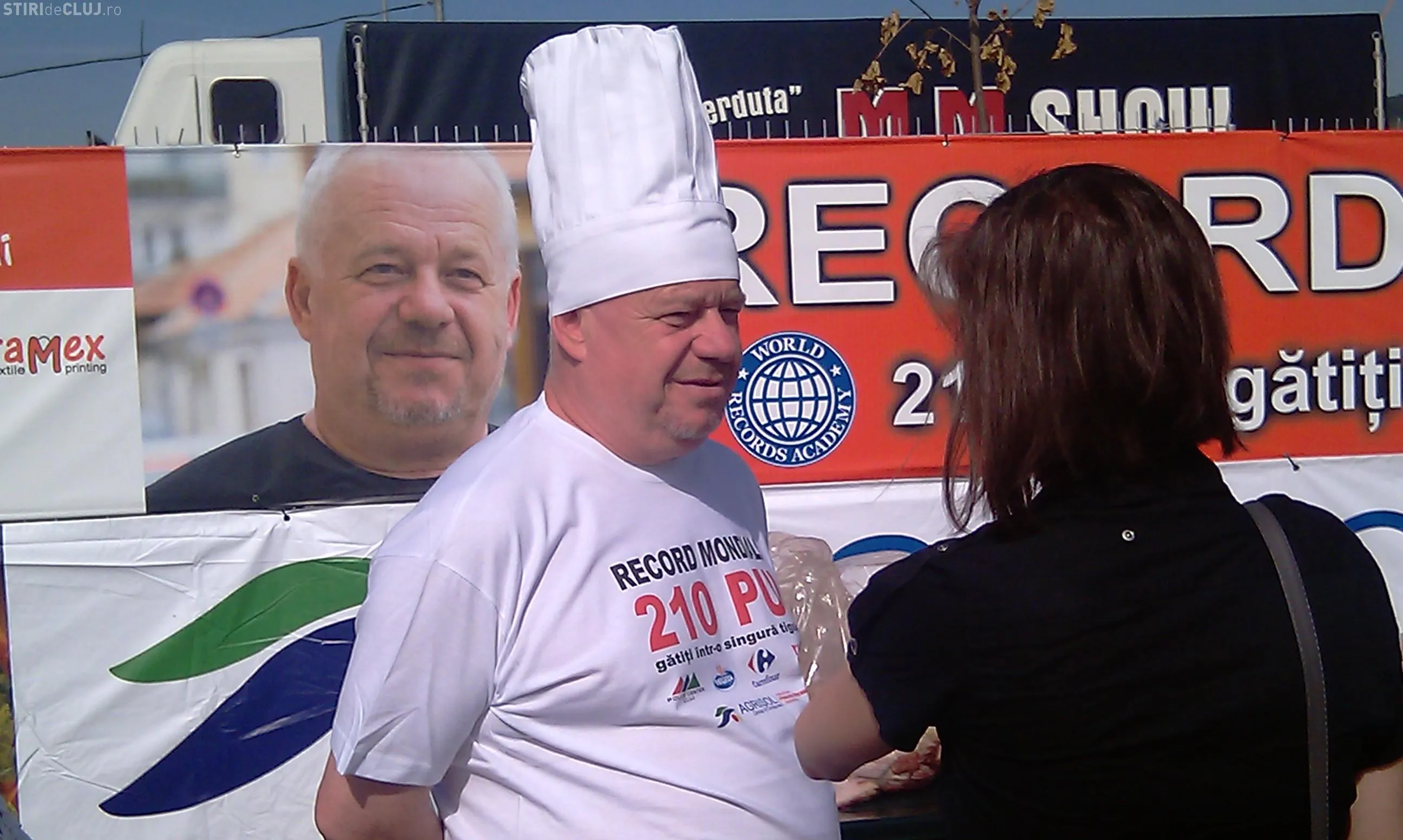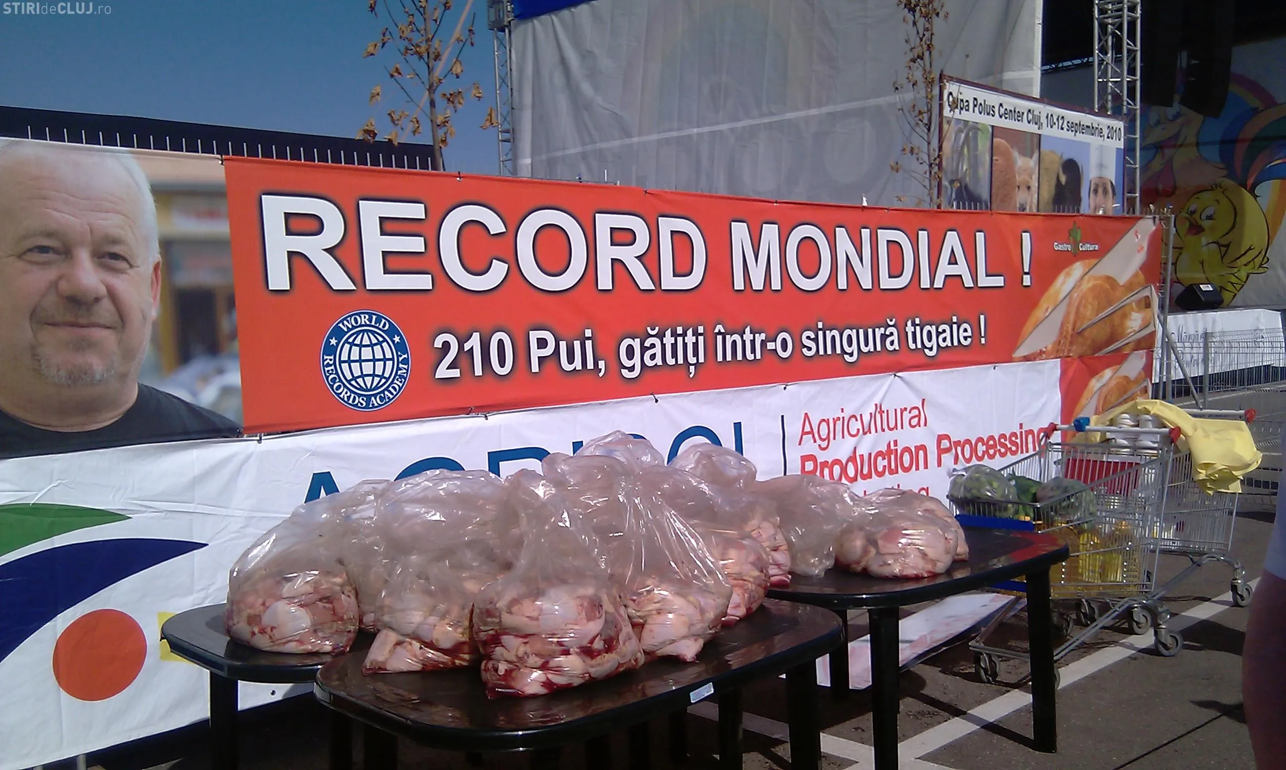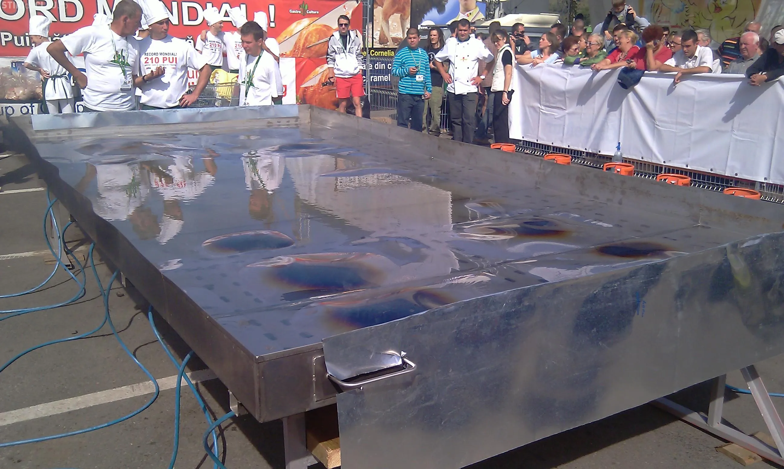 Clujeanul Tibi Kiss Budai spera sa doboare astazi recordul mondial si sa prajeasca 210 pui intr-o tigaie de 15 metri patrati. De la ora 11.00 au fost pregatite mirodeniile si acum este asteptat juriul pentru ca bucatarul sa treaca la treaba.