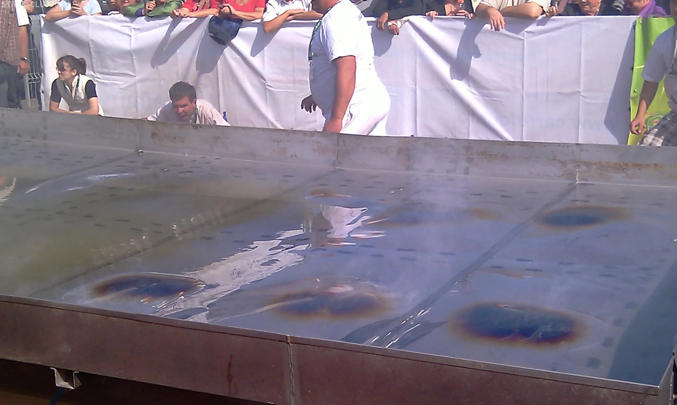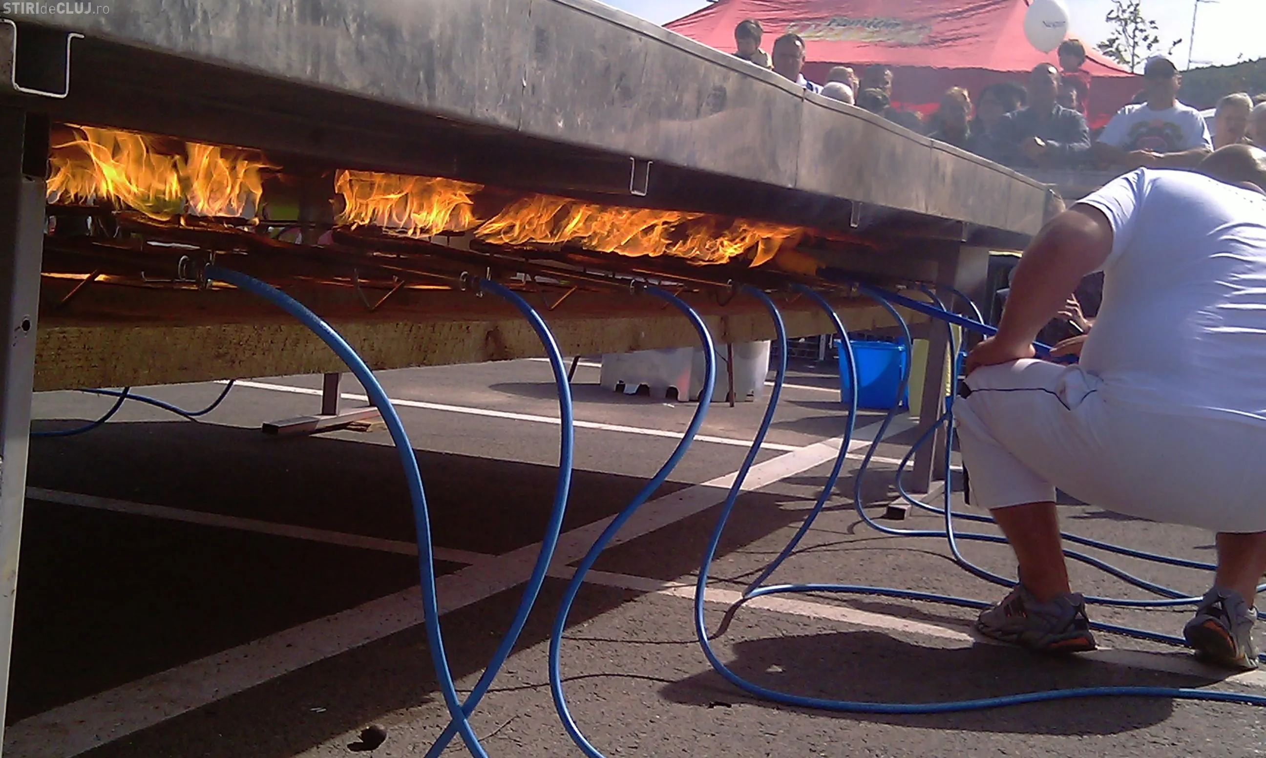 Bucatarul a asistat personal, in jurul orei 12.00, la aprinderea celor 15 butelii cu gaz, cu care va fi incinsa tigaia gigant. "Am avut unele probleme si tigaia s-a cam incins pe alocuri si s-a umflat, dar este normal pentru ca suprafata de ardere este foarte mare. Acum asteptam juriul pentru a putea incepe. Fara ei nu se poate face nimic, pentru ca vrem ca recordul sa fie si omologat", a mai afirmat Tibi Kiss Budai.