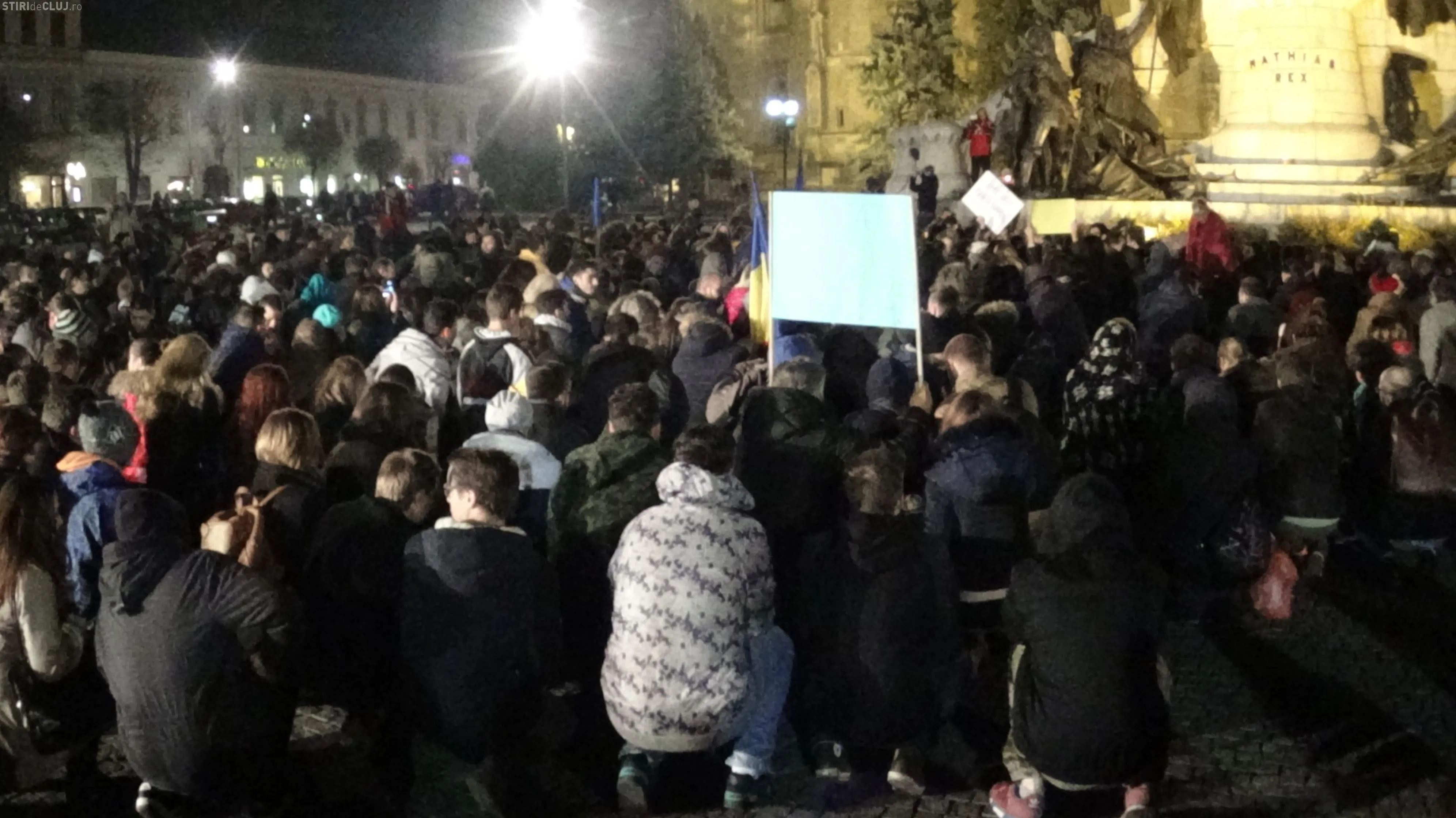 Mii de tineri din Cluj-Napoca a îngenunchiat în Piața Unirii, miercuri seara, și au ținut un moment de reculegere în memoria victimelor incendiului de la Club Colectiv.