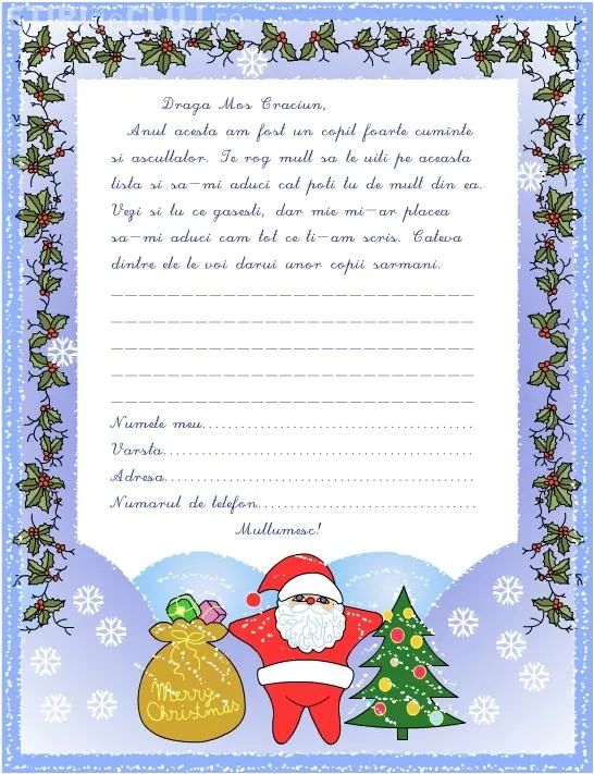 "Draga mosule, isi incepe Adina, o fetita de numai trei ani scrisoarea, te rog sa imi aduci o trusa de machiaj cu care sa ma pot face frumoasa ca si mama, pentru ca pe a ei nu mai vrea sa mi-o dea dupa ce m-am fardat intr-o zi si am terminat-o aproape toata. Si te rog, adu-i si lui mami una, ca sa nu mai fie suparata pe mine. Iar lui tati multi bani ca sa poata sa imi cumpere tot ce vreau ca mereu spune ca nu are bani".