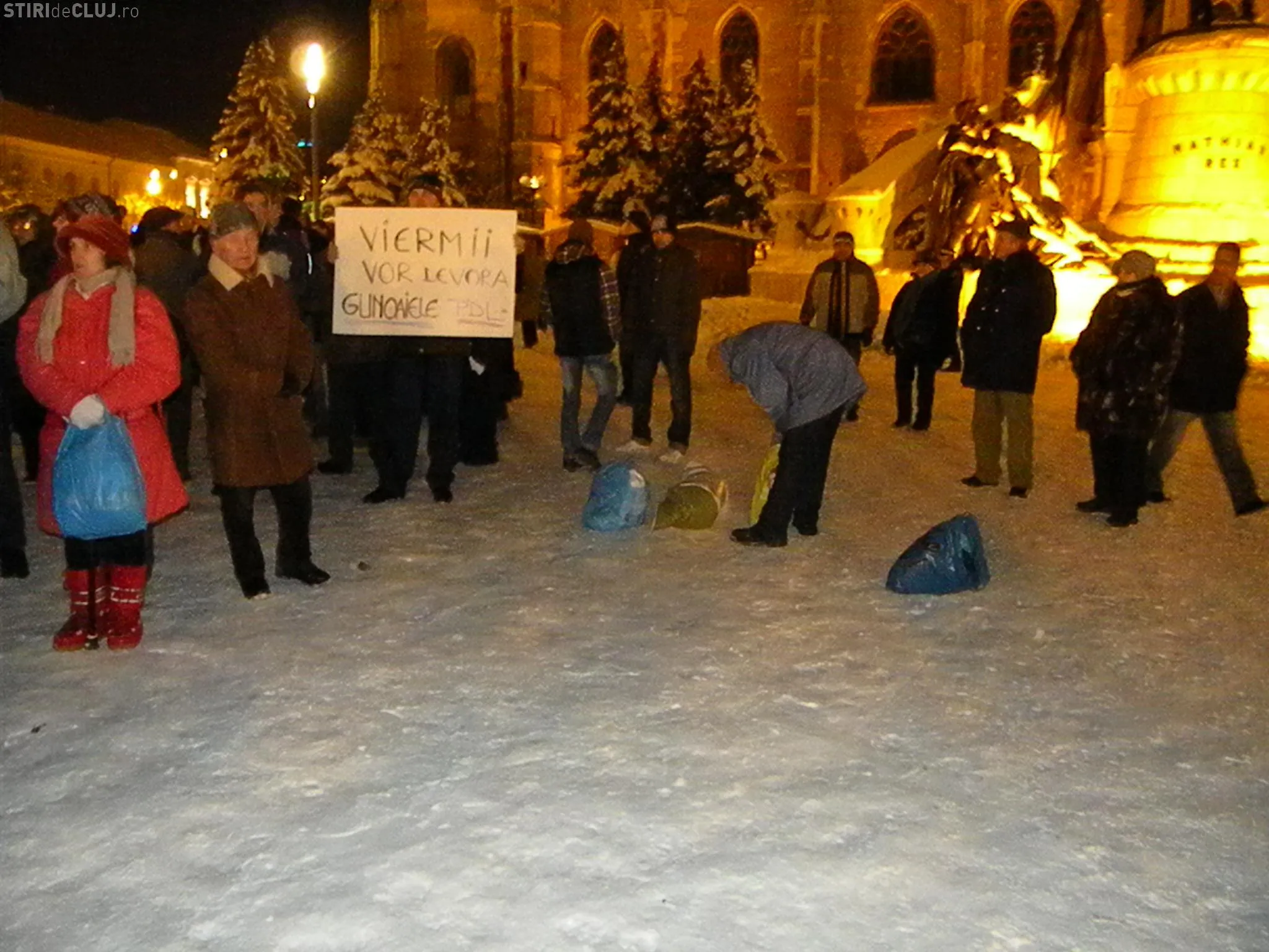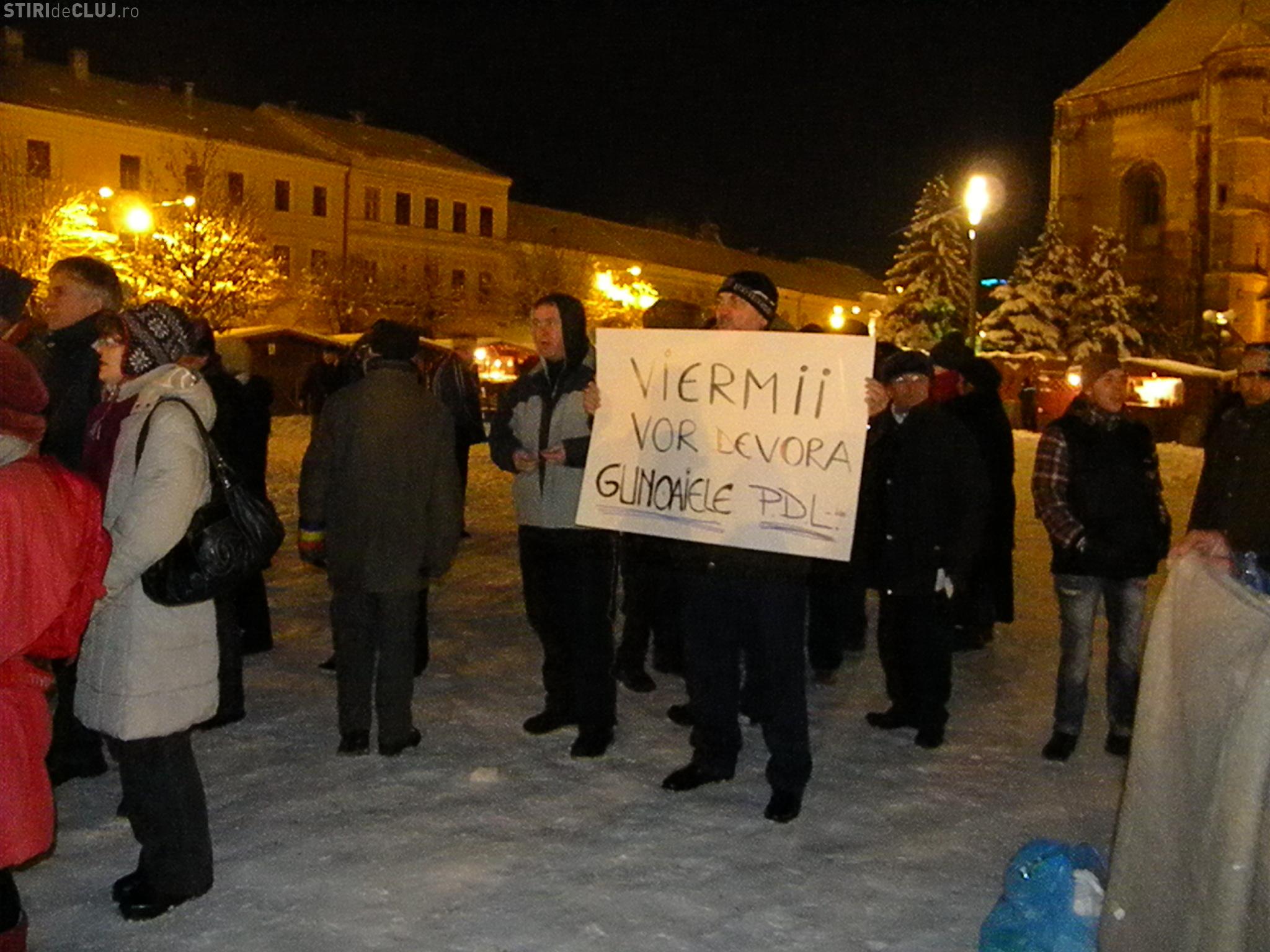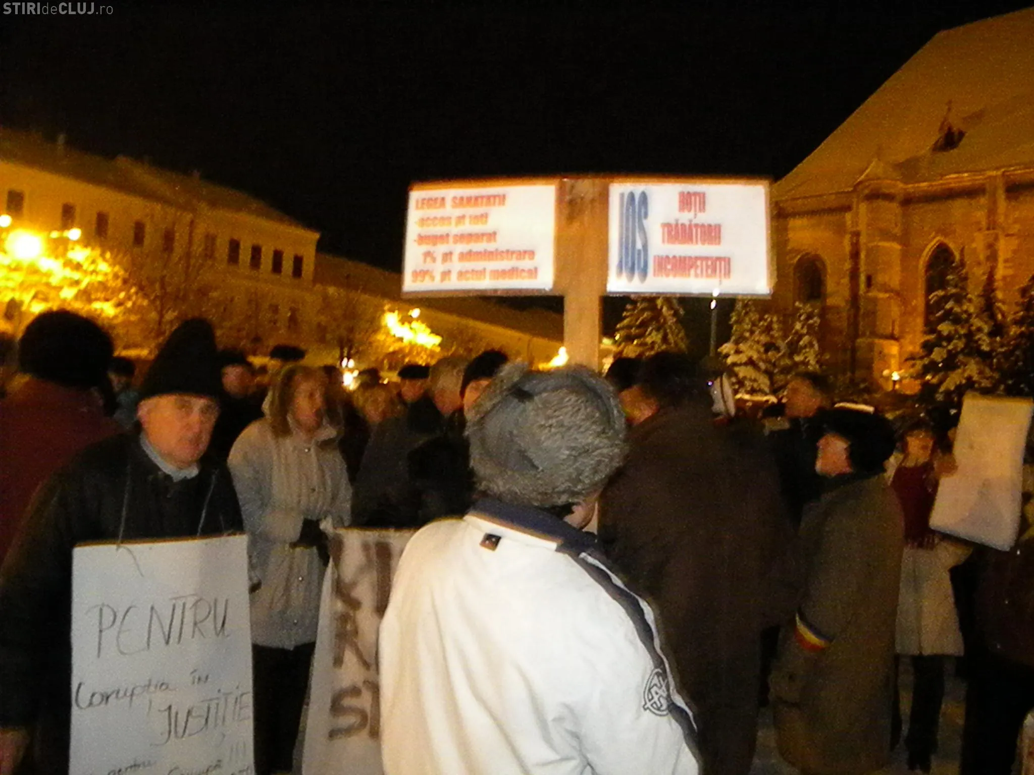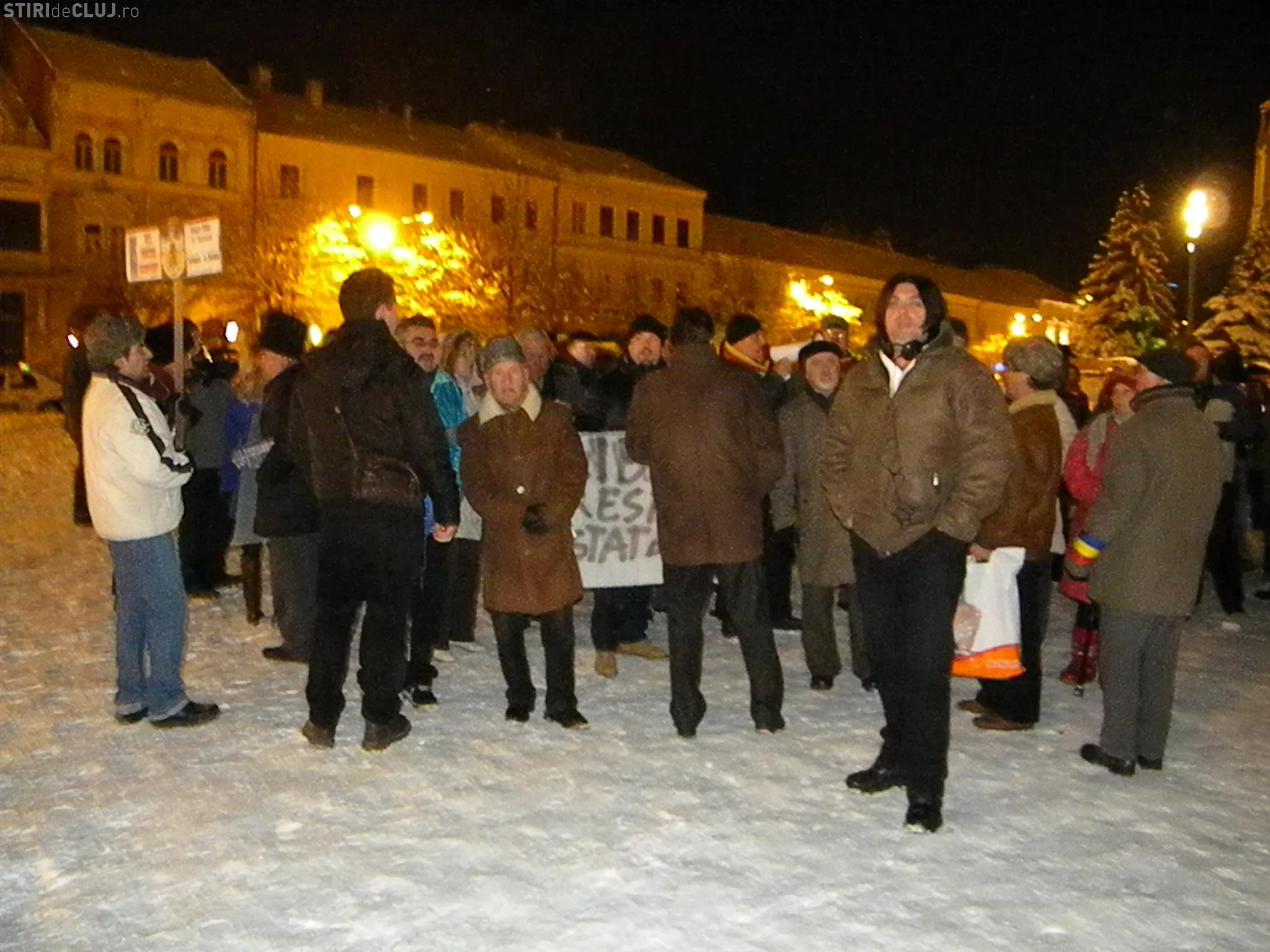 Protestele de la Cluj, impotriva presedintelui Traian Basescu, s-au transformat in manifestatii ale pensionarilor. Putini tineri si-au mai facut aparitia in Piata Unirii, pana la ora 19.00, adunandu-se in total circa 50 de oameni.