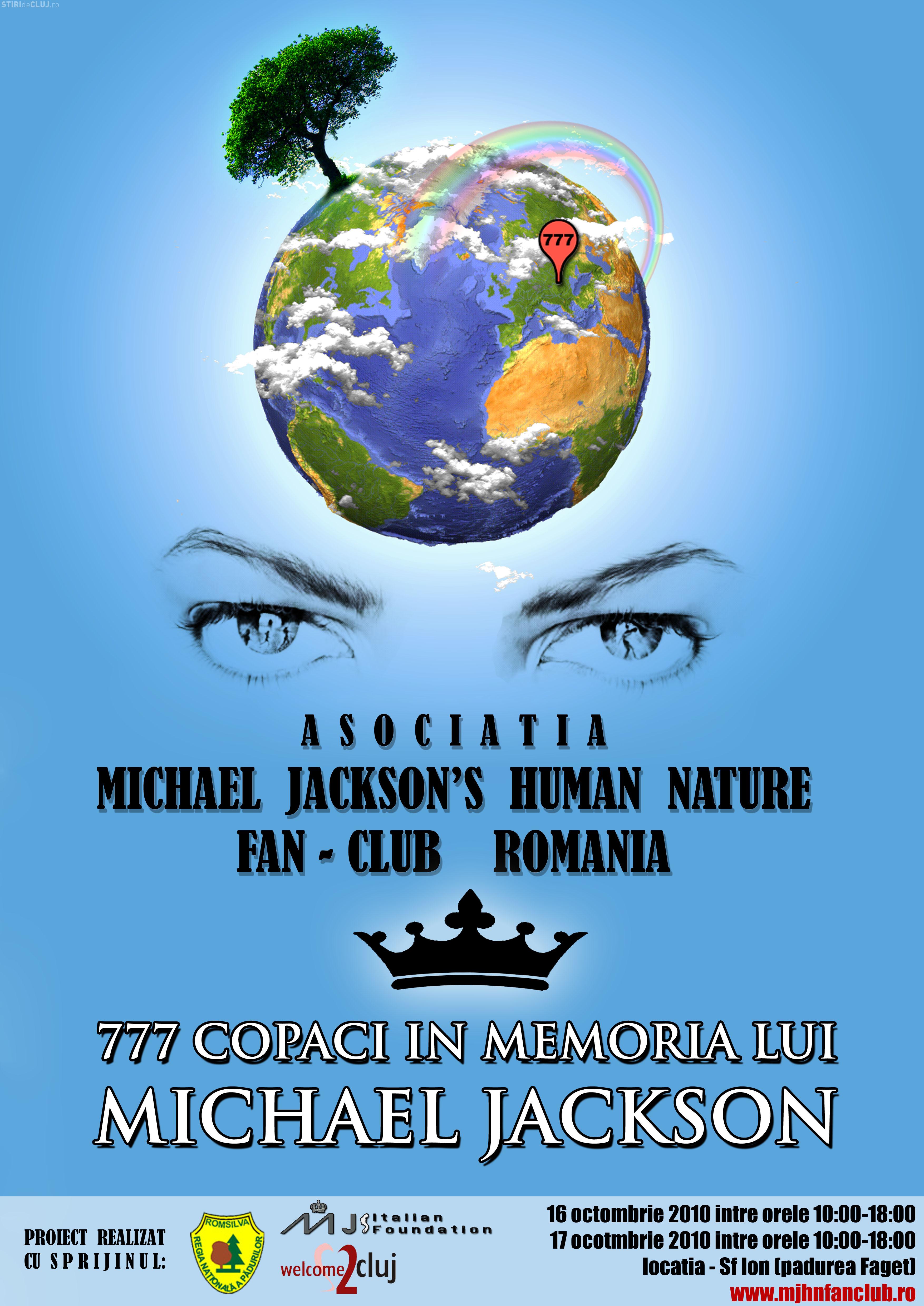 777 de copaci vor fi plantati la Cluj in memoria lui Michael Jackson, in zilele de 16-17 octombrie, de la ora 10.00. Actiunea ecologica este organizata de Asociatia Michael Jackson Human Nature's Fan Club Romania.