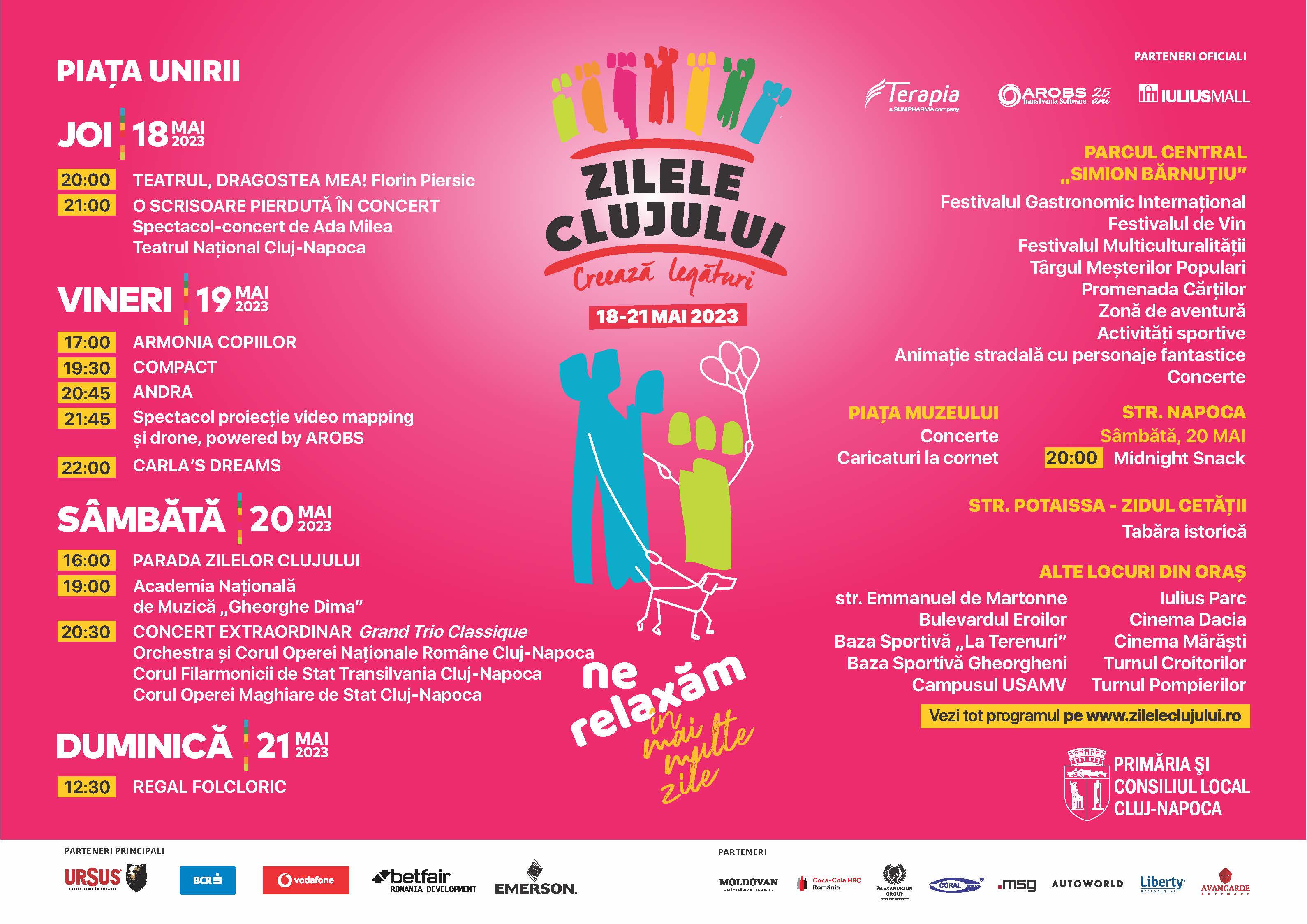 Informații și noutăți se publică zilnic pe canalele social media ale Zilelor Clujului și Primăriei Cluj-Napoca. Programul complet, pe zileleclujului.ro.