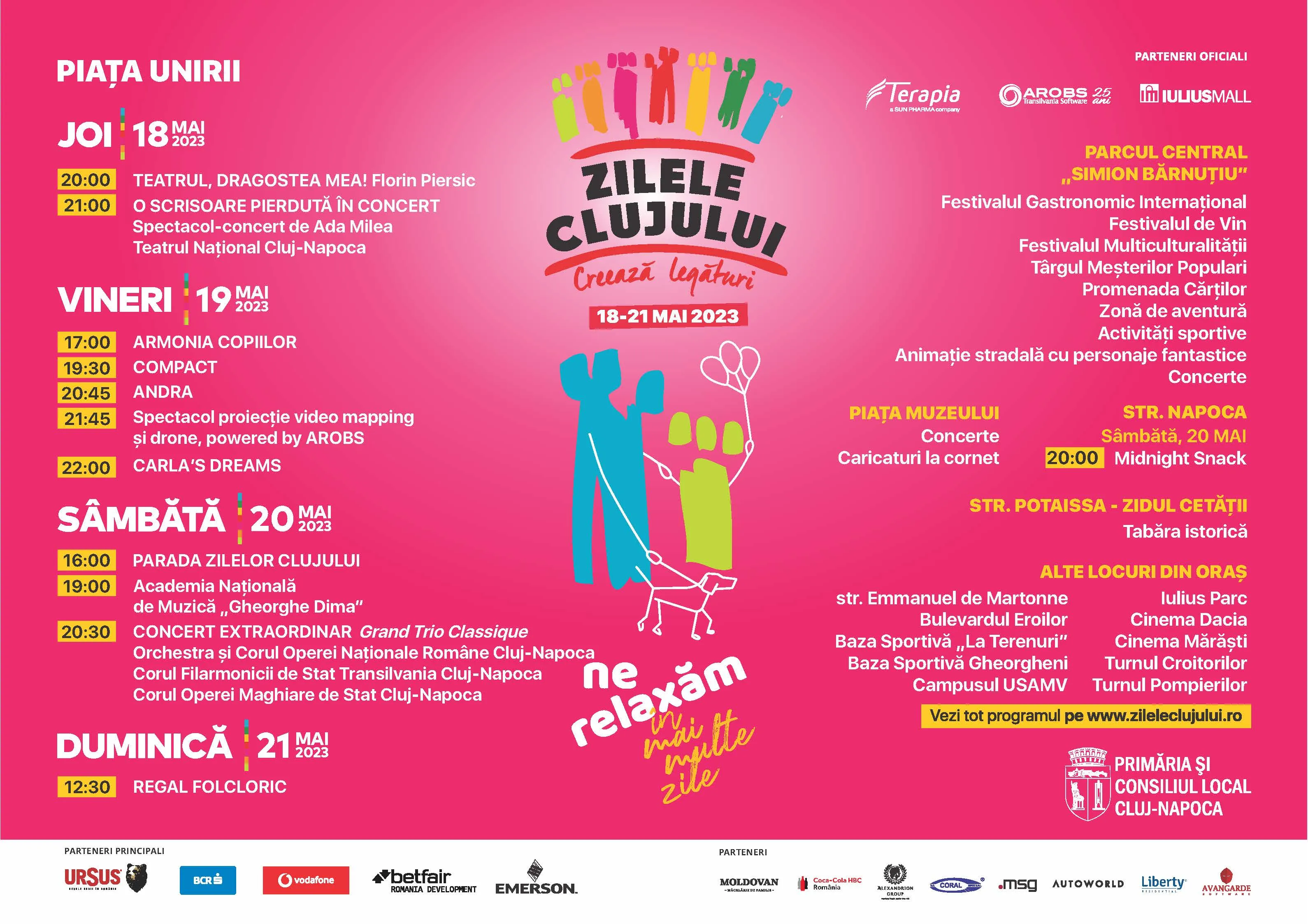 Regăsiți mai jos o parte dintre evenimentele de joi și vineri, iar programul complet se găsește pe site-ul evenimentului www.zileleclujului.ro/2023/program sau în broșura evenimentului care poate fi accesată de pe acest link:
