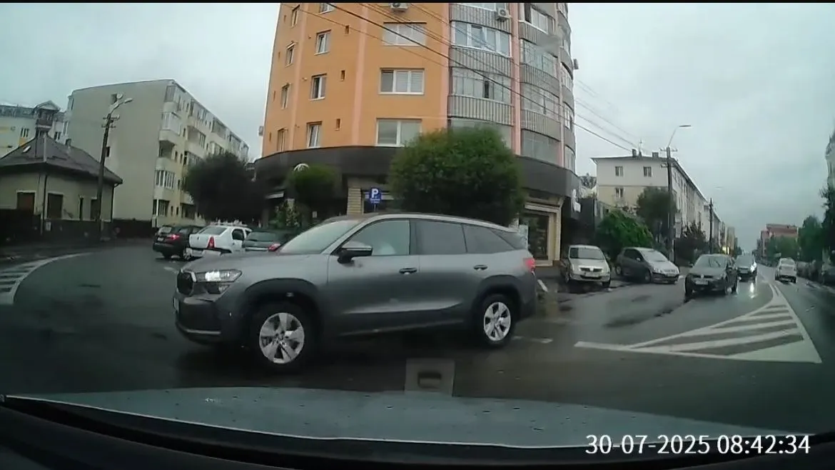 Totul s-a petrecut într-o zonă intens circulată din oraș, unde sensurile giratorii sunt menite să fluidizeze traficul, nu să-l transforme într-o ruletă rutieră. Din imagini surprinse de o cameră de bord, se vede clar cum mașina vine din lateral și, fără nicio intenție de a opri sau de a încetini, pătrunde direct în sens, obligând șoferul aflat deja în giratoriu să frâneze brusc pentru a evita impactul.