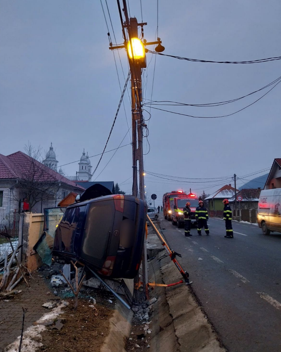 Accident Cluj- O mașină s-a răsturnat. A doborât un stâlp și a distrus branșamentul de gaz FOTO