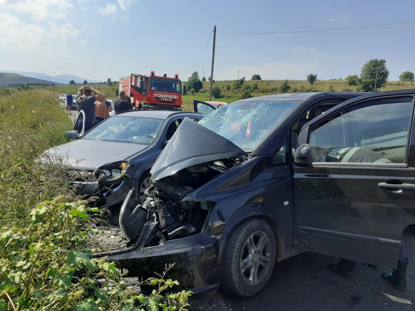 În urma coliziunii, microbuzul a fost proiectat într-un autoturism aflat pe aceeași direcție de mers.